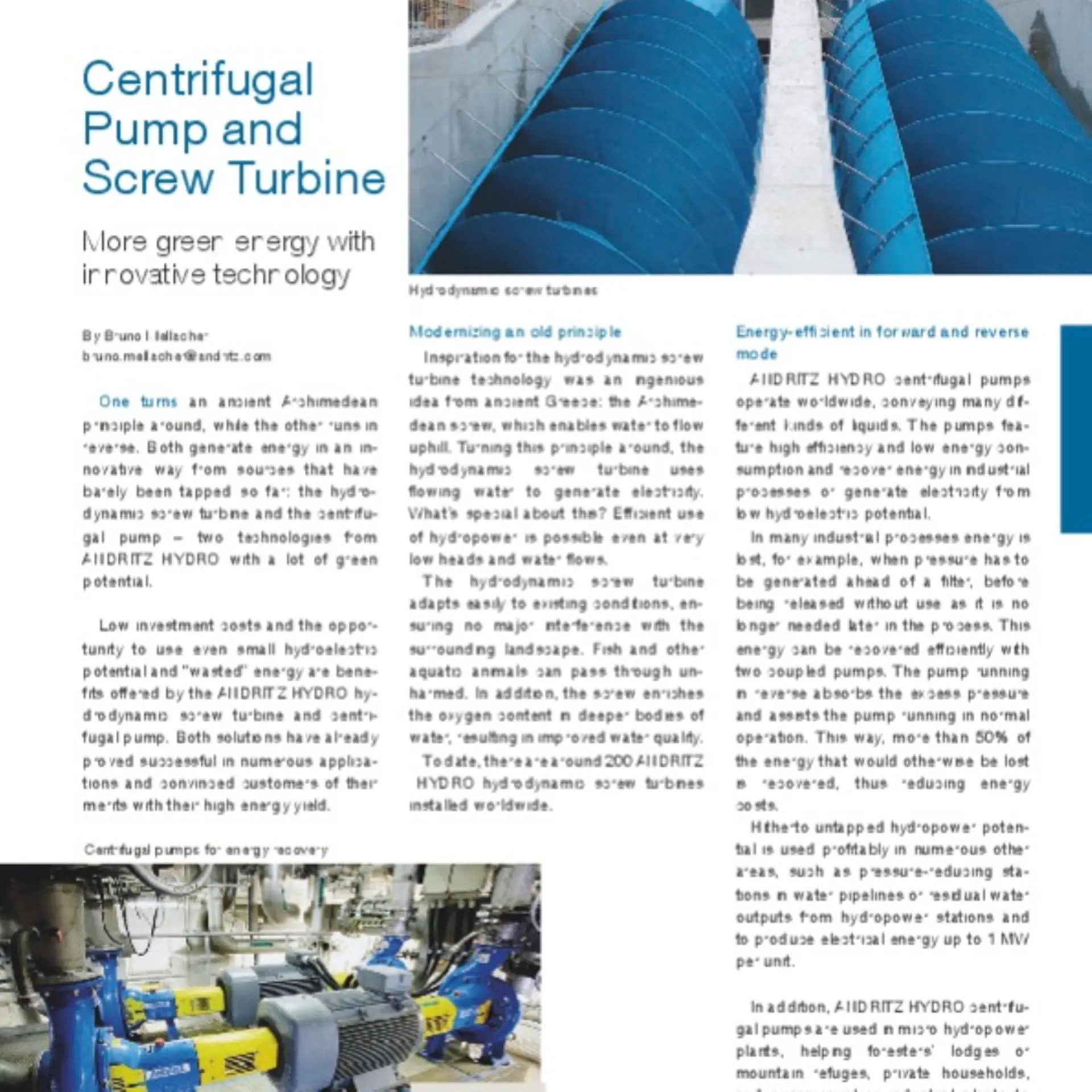 Both generate energy in an innovative way from sources that have barely been tapped so far: the hydrodynamic screw turbine and the centrifugal pump - two technologies from ANDRITZ HYDRO with a lot of green potential.