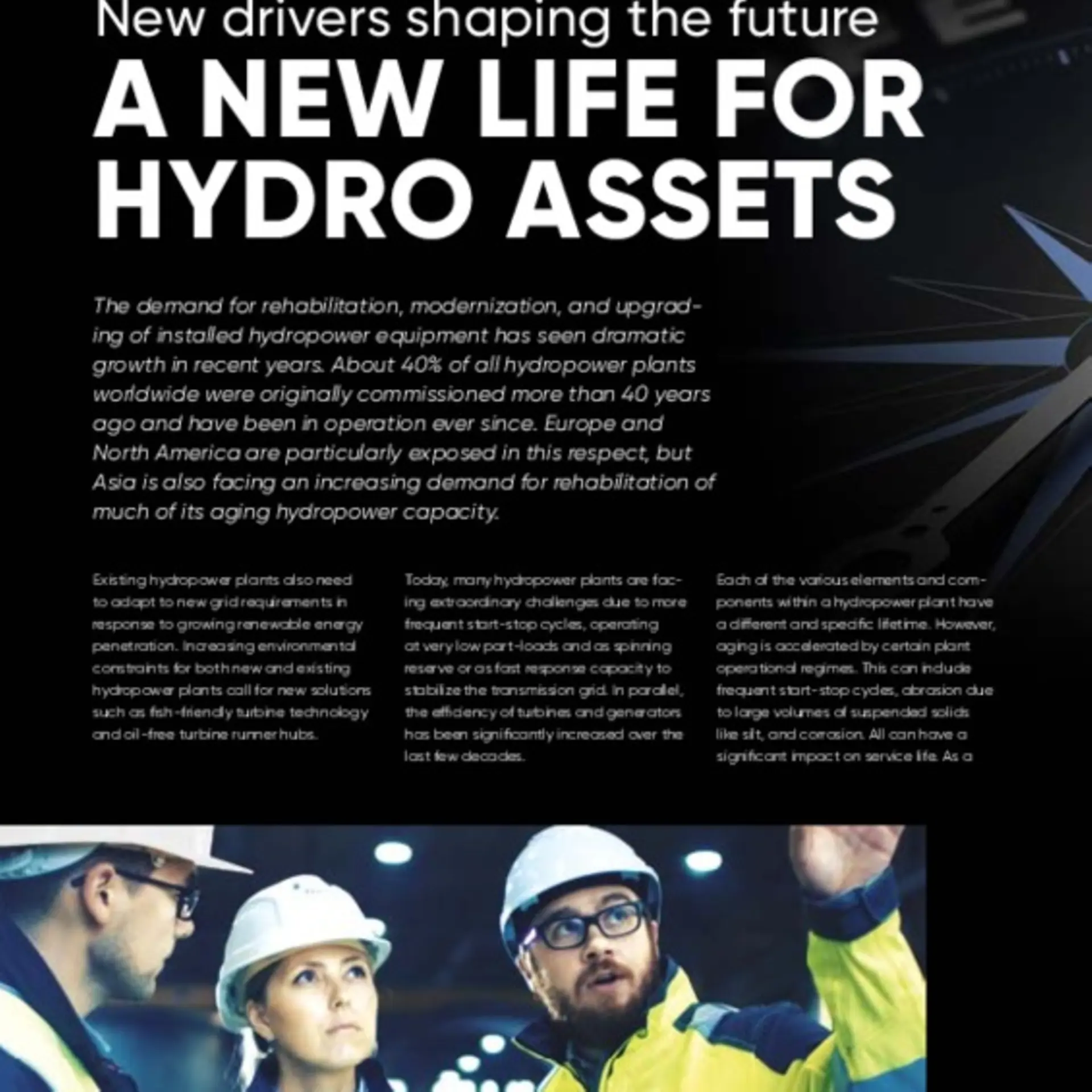 The demand for rehabilitation, modernization, and upgrading of installed hydropower equipment has seen dramatic growth in recent years. About 40% of all hydropower plants worldwide were originally commissioned more than 40 years ago and have been in operation ever since. Europe and North America are particularly exposed in this respect, but Asia is also facing an increasing demand for rehabilitation of much of its aging hydropower capacity.