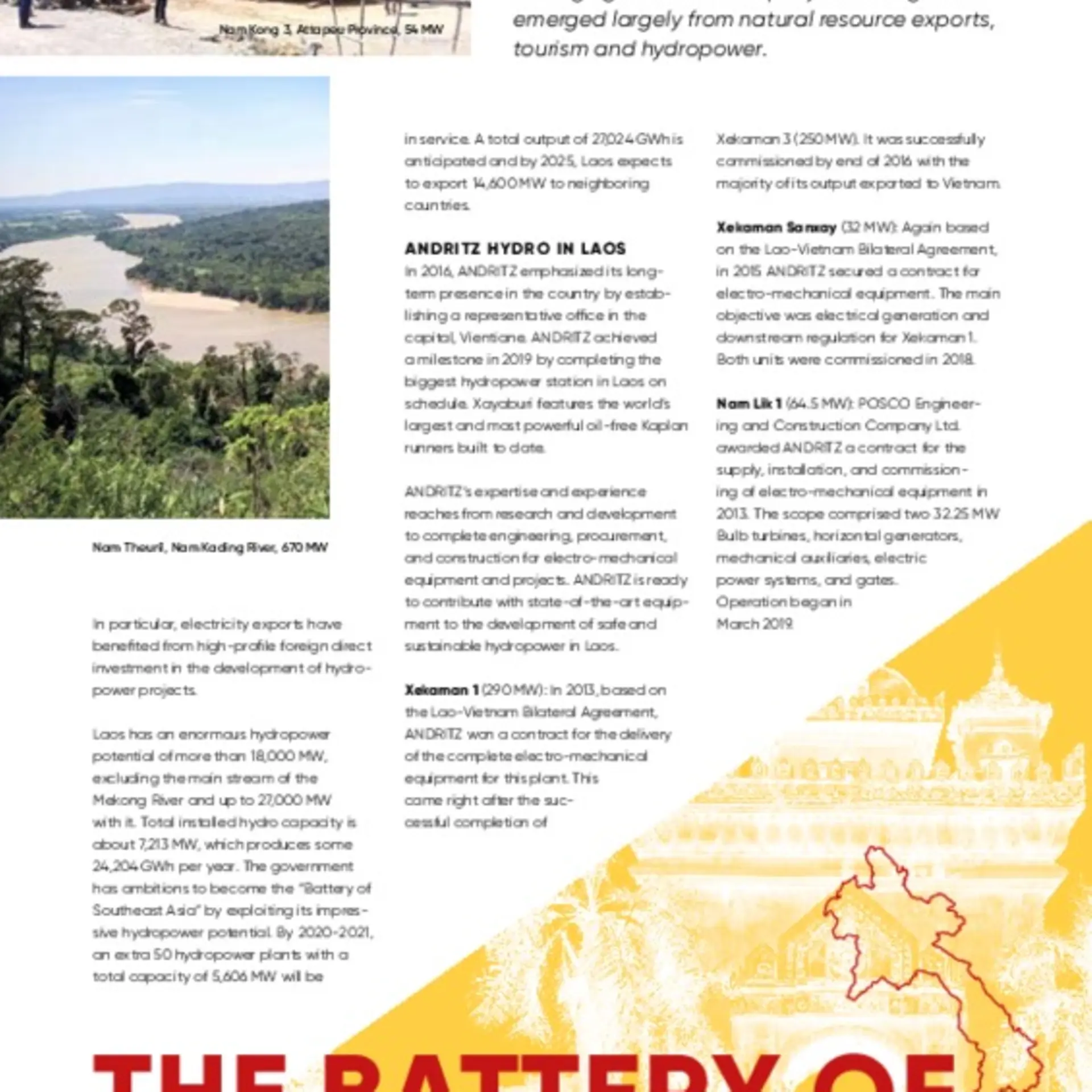 ANDRITZ’s expertise and experience reaches from research and development to complete engineering, procurement, and construction for electro-mechanical equipment and projects. ANDRITZ is ready to contribute with state-of-the-art equipment to the development of safe and sustainable hydropower in Laos.