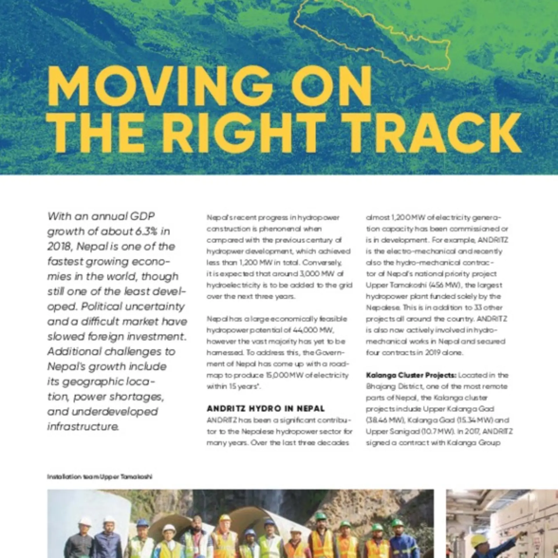 Kalanga Cluster Projects: Located in the Bhajang District, one of the most remote parts of Nepal, the Kalanga cluster projects include Upper Kalanga Gad (38.46 MW), Kalanga Gad (15.34 MW) and Upper Sanigad (10.7 MW). In 2017, ANDRITZ signed a contract with Kalanga Group of Companies, a well-known independent power producer in Nepal and the developer of these projects. The scope includes the supply of three vertical, four-jet Pelton turbines for Upper Kalanga Gad, two horizontal Francis turbines for Kalanga Gad, and two horizontal Pelton turbines for Upper Sanigad. The scope also includes the entire electro-mechanical equipmment as well as erection and commissioning.