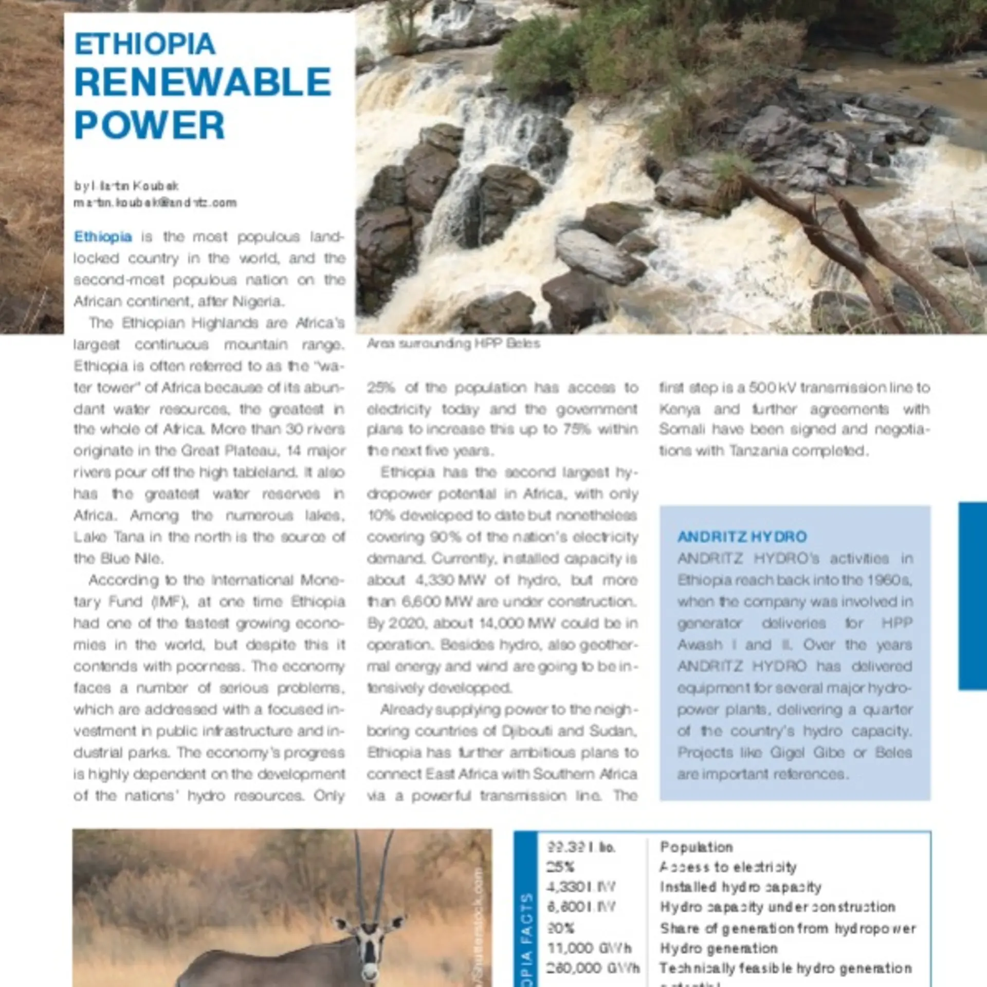 Ethiopia has the second largest hydropower potential in Africa, with only 10% developed to date but nonetheless covering 90% of the nation’s electricity demand. Currently, installed capacity is about 4,330 MW of hydro, but more than 6,600 MW are under construction. By 2020, about 14,000 MW could be in operation. Besides hydro, also geothermal energy and wind are going to be intensively developped.