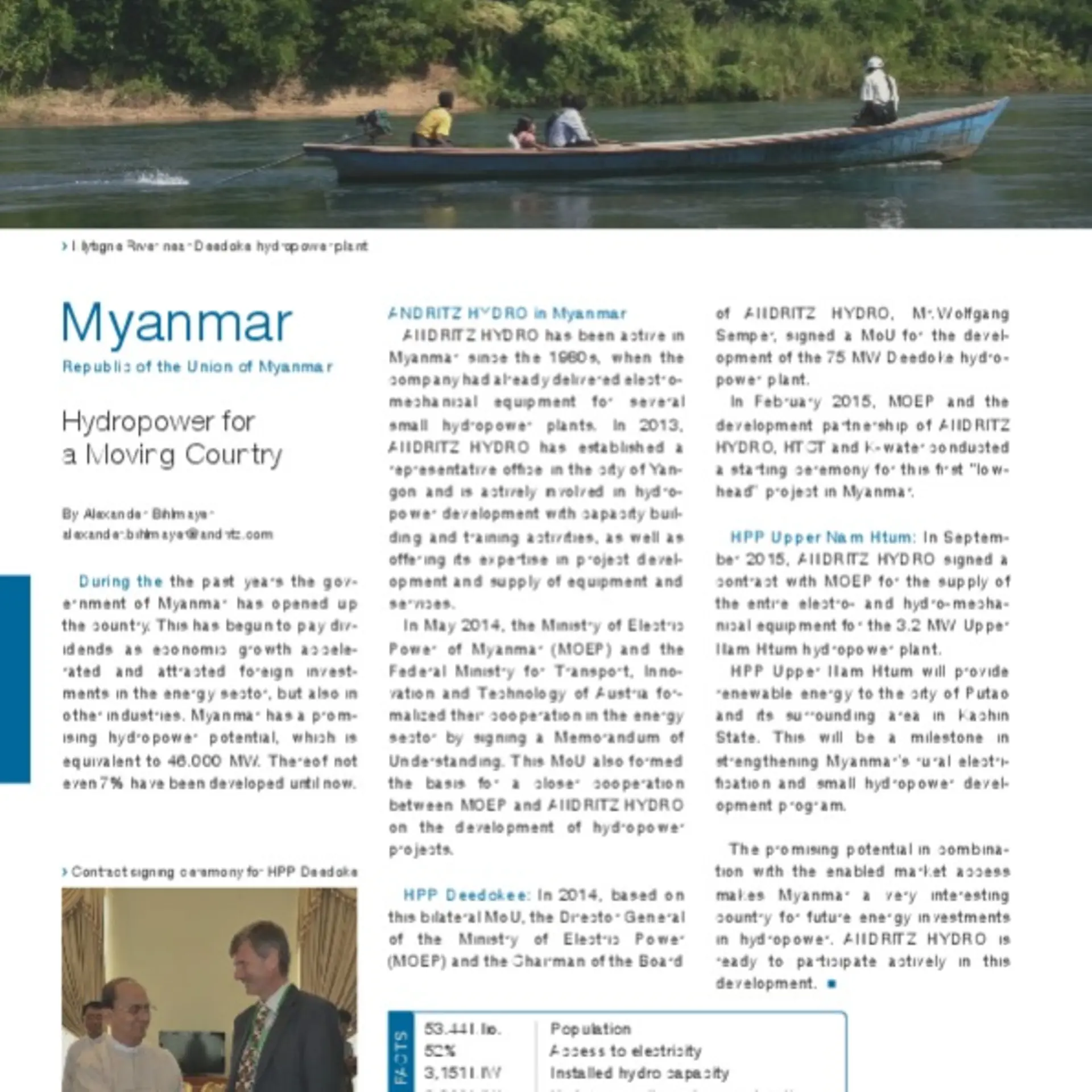 In May 2014, the Ministry of Electric Power of Myanmar (MOEP) and the Federal Ministry for Transport, Innovation and Technology of Austria formalized their cooperation in the energy sector by signing a Memorandum of Understanding. This MoU also formed the basis for a closer cooperation between MOEP and ANDRITZ HYDRO on the development of hydropower projects.
