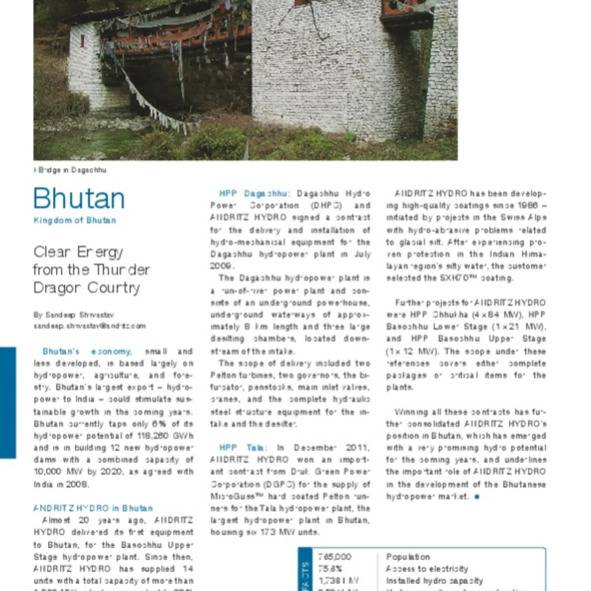 Almost 20 years ago, ANDRITZ HYDRO delivered its first equipment to Bhutan, for the Basochhu Upper Stage hydropower plant. Since then, ANDRITZ HYDRO has supplied 14 units with a total capacity of more than 1,500 MW, which is equivalent to 88% of the total country's installed capacity.