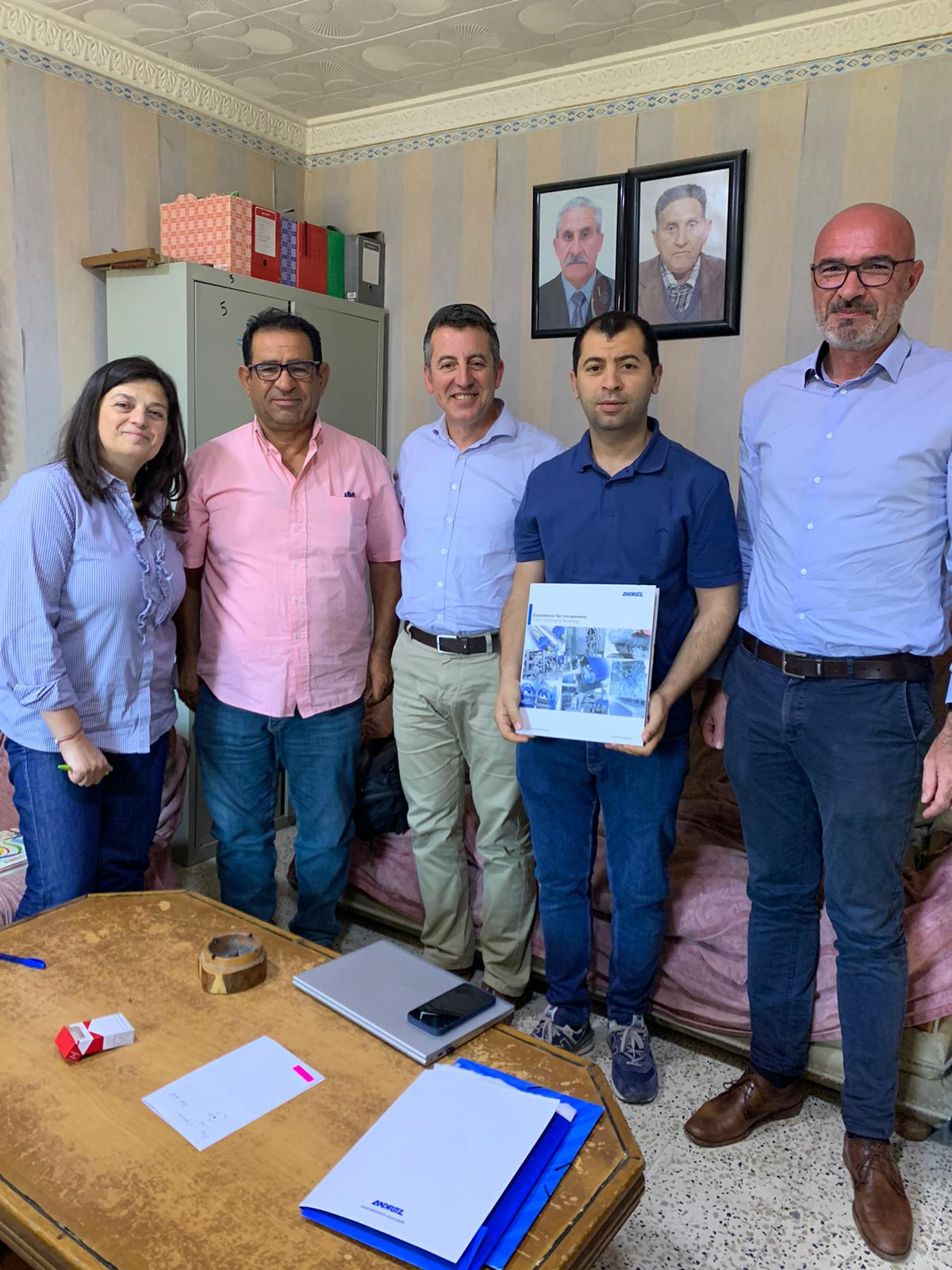 Contract signature at Kherib familly’s facility in Bejaia, Algeria. From left to right: Caterina Potenza (Sales Agent), Farid Kherib (Founder of SNC Kherib), Nicolas Canas (ANDRITZ Area Sales Manager), Smail Kherib (General Manager of SNC Kherib), Arnaud Laroche (ANDRITZ Head of Sales Spunlace)