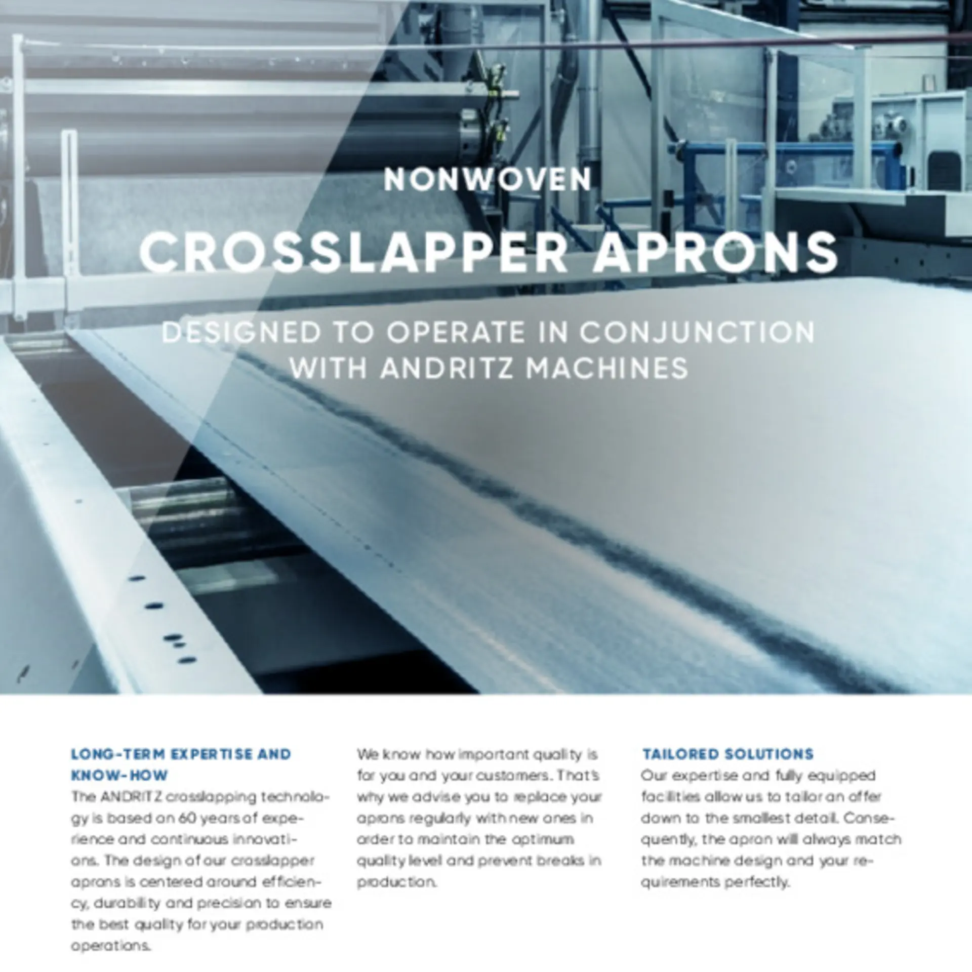 Thanks to ANDRITZ‘s fully equipped facilities, we can offer complete control over and traceability of every single component that goes into the crosslapper. Thus, we control the mass, thickness and stiffness of our aprons in addition to testing the tearing, stretching and friction coefficients through advanced tribology procedures. Our cutting-edge machine allows us to dimension the aprons precisely according to your machine design. Finally, we have designed our aprons with durability in mind so that they will last longer.