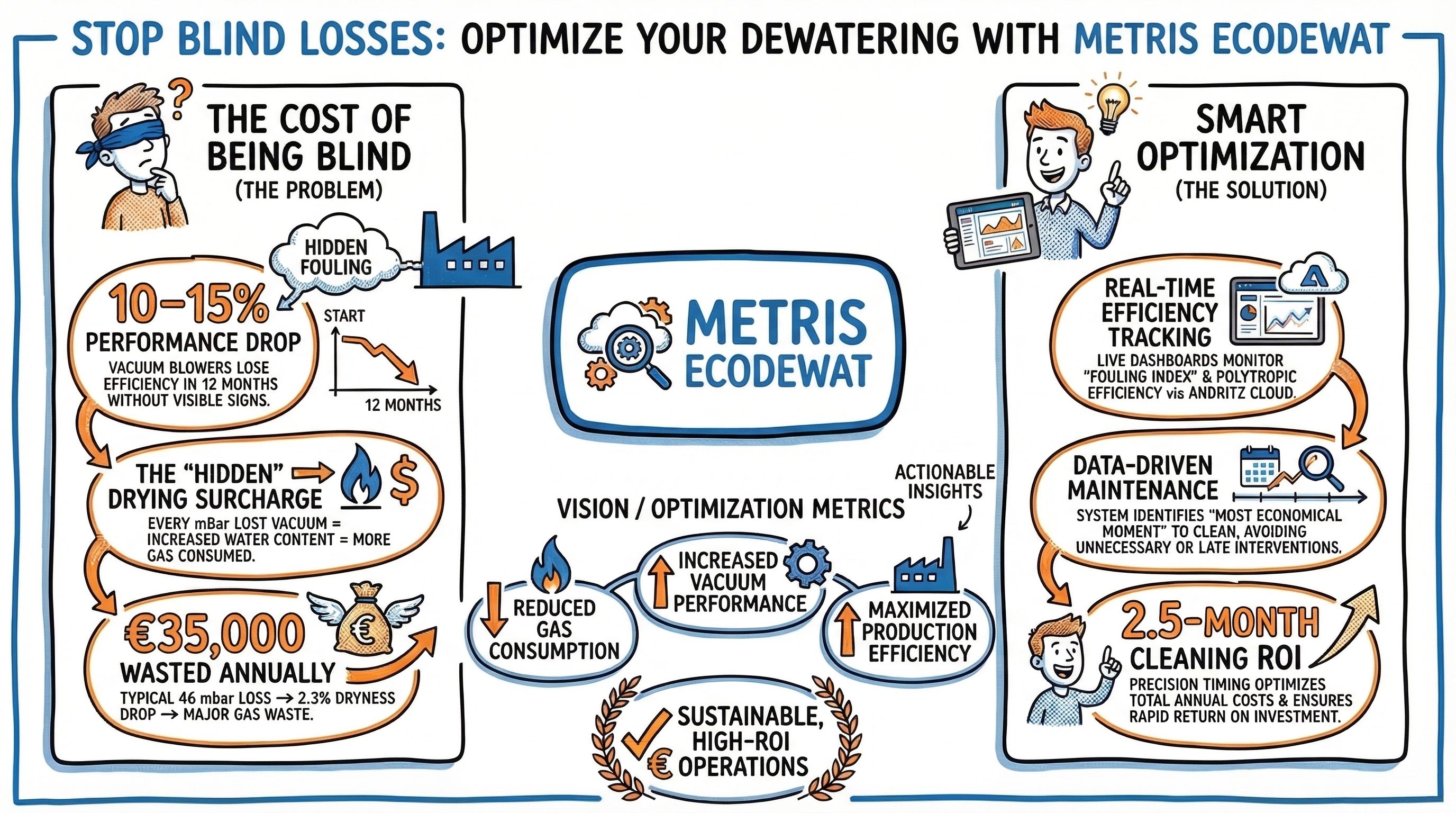 Industrial dewatering is one of the most energy‑intensive steps in production—yet a significant part of this energy loss remains invisible. Over time, vacuum blowers naturally foul and lose performance, often without any clear warning signs. This leads to higher drying costs, reduced dryness, and unnecessary maintenance interventions.