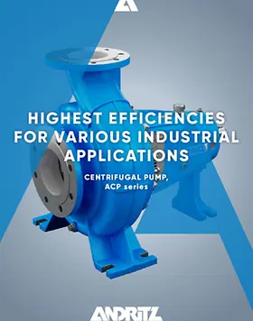 ANDRITZ single-stage centrifugal pumps from the ACP are available in a highly wear-resistant, open impeller design. Thanks to their low axial thrust and open channels, these pumps are suitable for conveying many different media. Depending on the impeller design, they can convey slightly contaminated and contaminated media with some solids and content with consistencies of up to 8%. Equipped with our innovative SMARTSEP degassing system an additional separation impeller acts as an integrated degassing system and removes gas from the media and conveys fibers reliably back to the pump at the same time. Thus, operating as processes pumps, they cover a wide range of applications in the pulp and paper, mining, offshore, power, food, and chemical industry. Additionally, ANDRITZ single-stage centrifugal pumps can also be used in water supply, waste water treatment, desalination plants, and irrigation as well as drainage. A modular system ensures high availability, enables the use of proven components and reduces the number of spare parts to be held in stock. ANDRITZ centrifugal pumps from the ACP series can be delivered with an Industrial Internet of Things integrated base. For more information on our single-stage centrifugal pumps from the ACP series please have a look at our brochures in the sidebar or contact us directly.