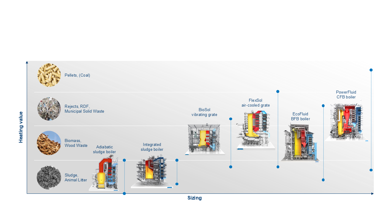 Designed for steam and power generation from mono-incineration of municipal sewage sludge. - FlexSol, water- and air-cooled reciprocating step grate and BioSol, water-cooled vibrating grate boiler