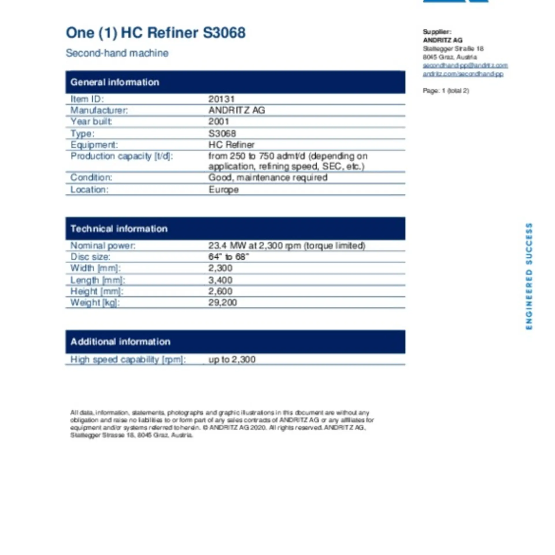 | Production capacity: | from 250 to 750 admt/d (depending on application, refining speed, SEC etc.) |