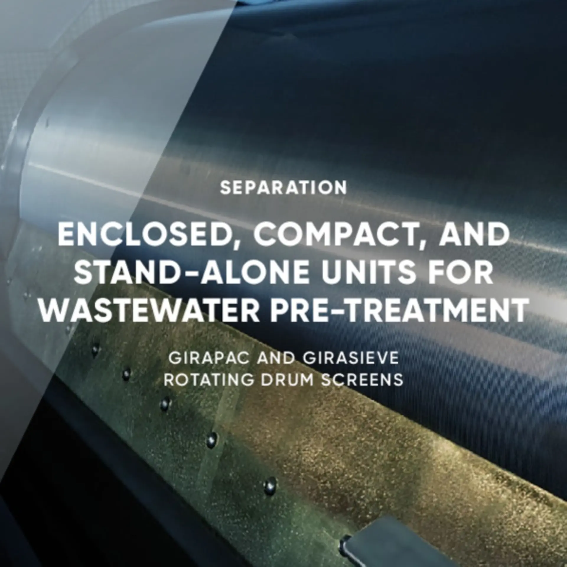 ANDRITZ rotating drums – Girapac and Girasieve - are enclosed, compact, and stand-alone units, mainly for full pre-treatment of wastewater entering municipal and industrial WWTPs. This type of rotating drum screen provides high solid/ liquid separation, as well as sieving, desanding, degreasing, and additionally, Girapac allows compacting and bagging of waste in one unit.