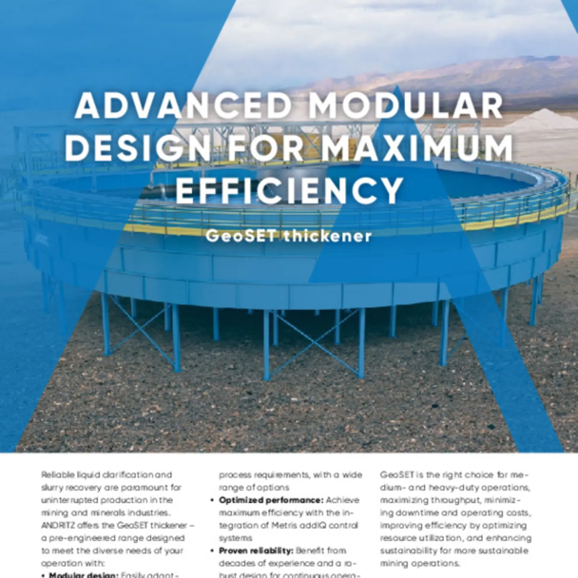 ANDRITZ EcoSET and GeoSET are a cost-efficient thickener range that handles light- to heavy-duty solid-liquid separation. The modular and standardized design reduces engineering requirements and delivery time. Increasing settling performance with precise flocculation for best possible outcome in terms of process and OPEX