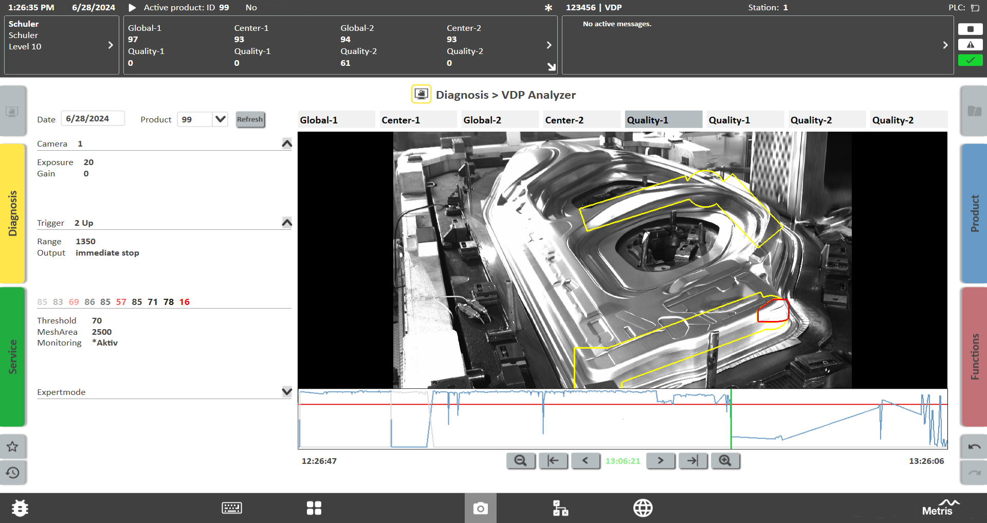 Für mehr Prozesssicherheit in der Fertigung werden bis zu acht Überwachungsfunktionen eingerichtet. Durch die Kontrolle unterschiedlicher Bereiche oder Prozessschritte kann Metris Visual Die Protection eine Vielzahl von Fehlerquellen abdecken, um unvorhergesehenen Störfällen vorzubeugen. So verringert sich nicht nur die Ausfallwahrscheinlichkeit, auch der sichere Betrieb der Anlagen wird gewährleistet.