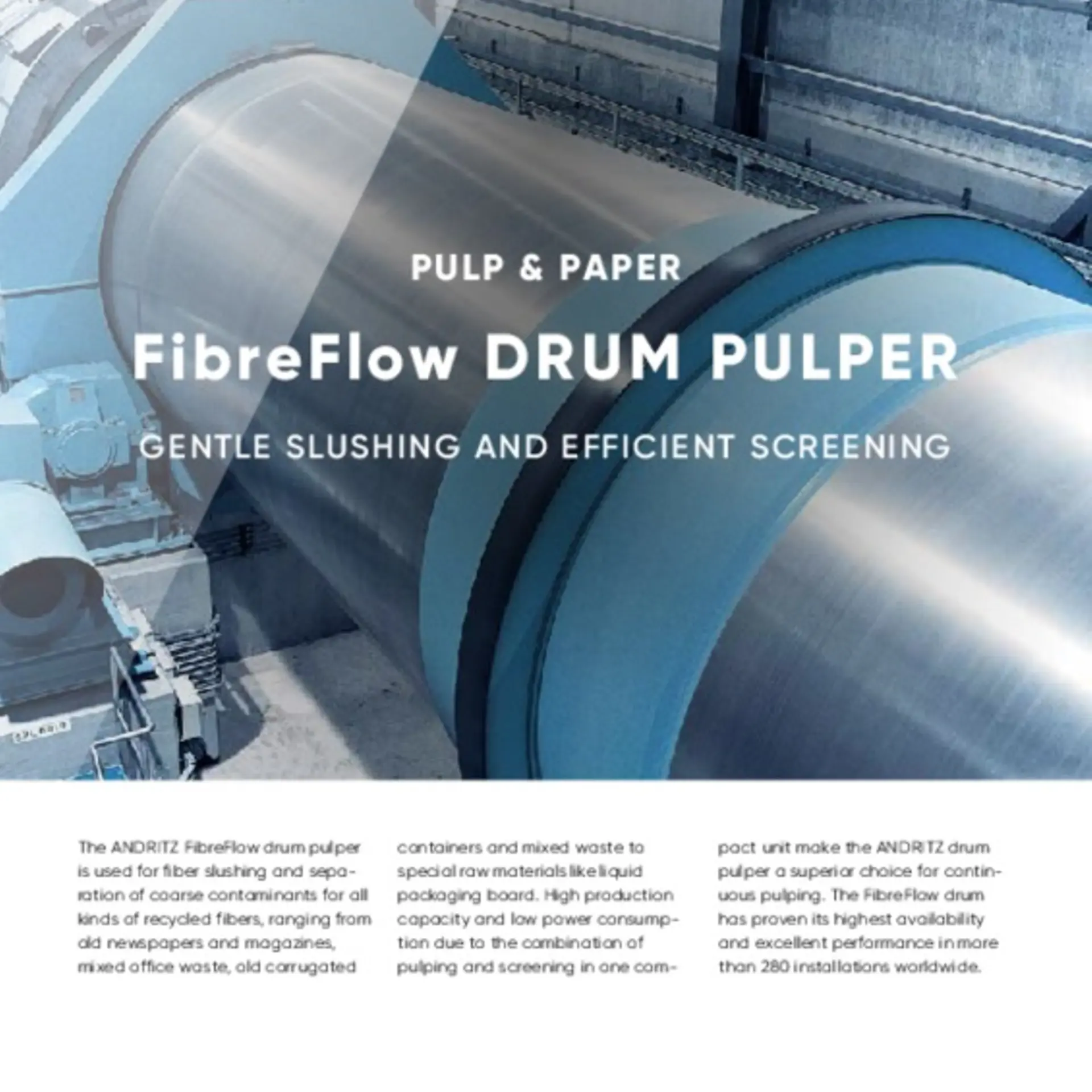 The ANDRITZ FibreFlow drum pulper is applied for all kinds of recovered papers and is the preferred choice for continuous pulping. With an installed base well over 200 units globally this pulping system represents gentle pulping and efficient coarse contaminant removal with minimum fiber loss and low power consumption.