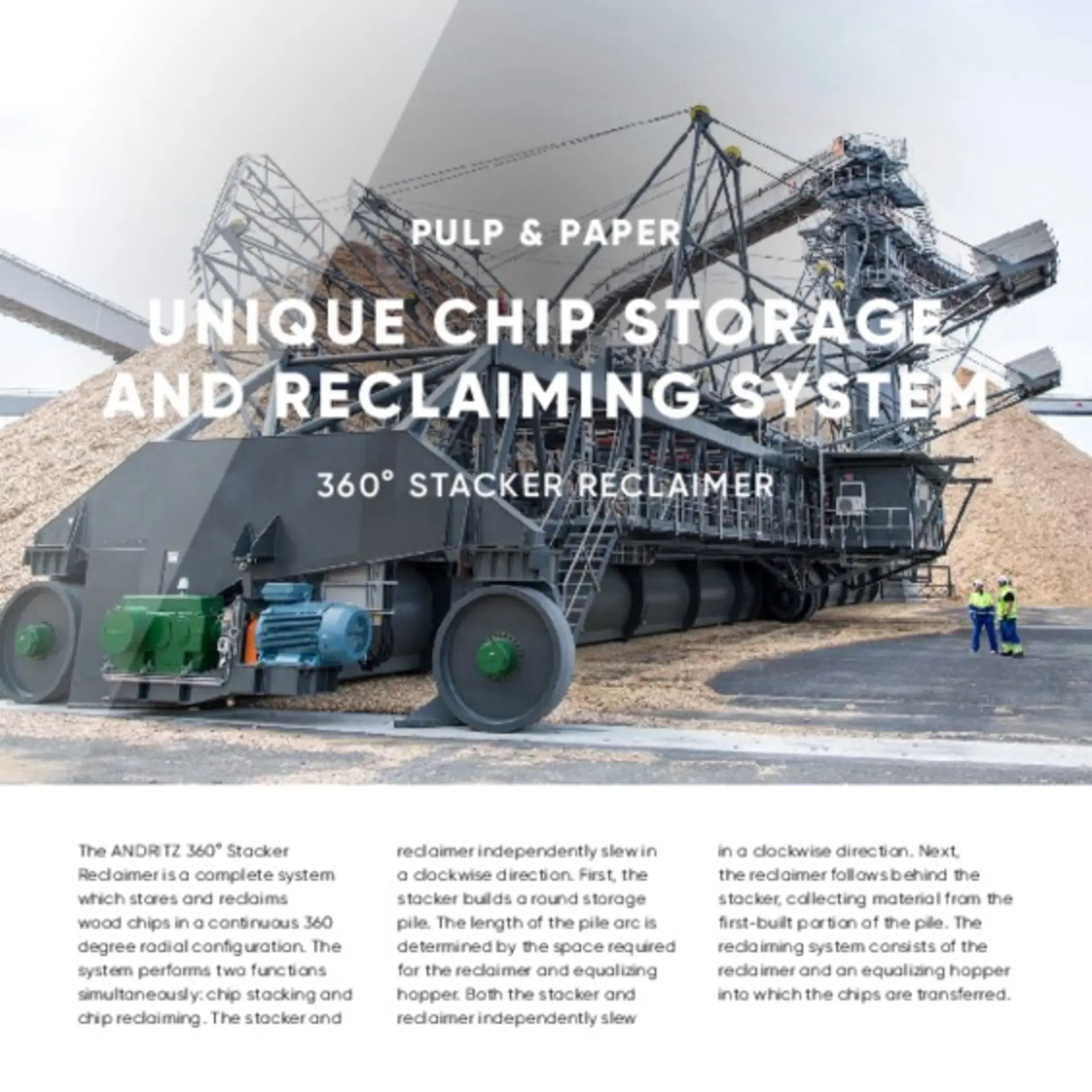 The ANDRITZ 360° stacker reclaimer is a complete system that stores and reclaims wood chips in a continuous 360-degree radial configuration.
