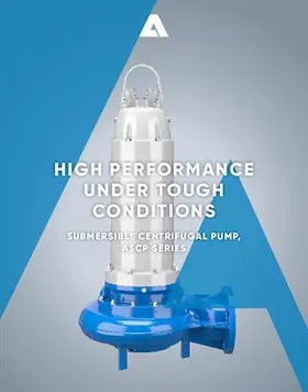 The ANDRITZ submersible centrifugal pump (ASCP series) is a single-stage centrifugal pump equipped with a submersible motor. The series has a range of different impellers - open, semi-open and closed. The design not only allows for optimal conveyance of pre-cleaned wastewater (for example inside a wastewater treatment plant) but also highest efficiencies of up to 80 percent. The sealing between pump and motor is achieved by means of high-quality of mechanical seals. At the same time, a monitoring system protects the motor against damage. The fields of application for the ASCP pump series are water treatment and wastewater plants, flood control, irrigation and drainage pumping stations.