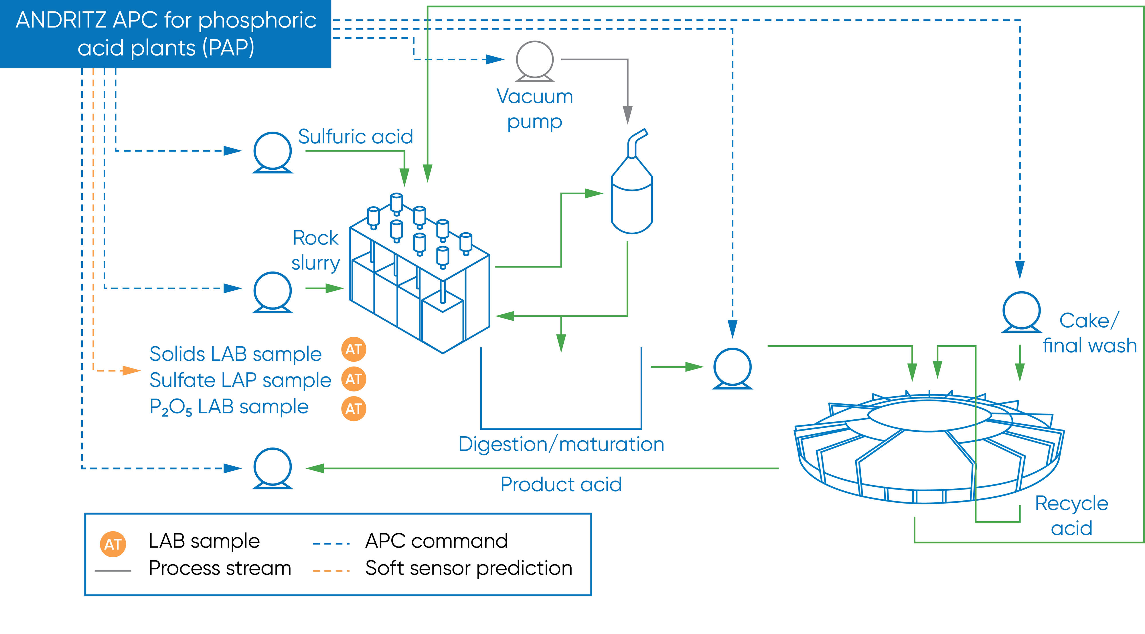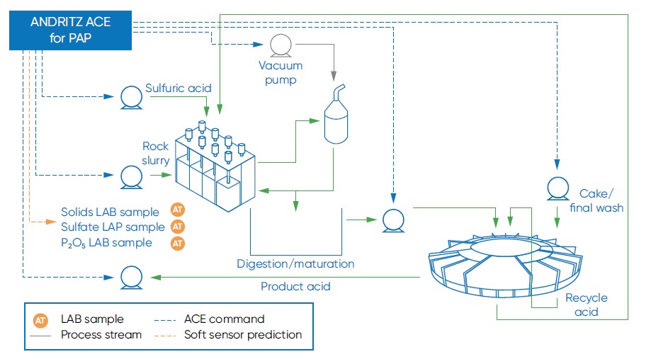 Furthermore, it manages all operating constraints and limits and sends operational targets to the plant’s automation system (DCS). Metris addIQ ACE continuously advises the operator on what is happening and why, also giving the operator an insight into how it analyzes and guides the process. With this customized solution, production is maximized while simultaneously minimizing the loss of phosphoric acid to tailings. It optimizes operation of the ANDRITZ tilting pan filter to maximize the concentration of the phosphoric acid product while minimizing loss of phosphoric acid in the gypsum by-product.