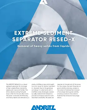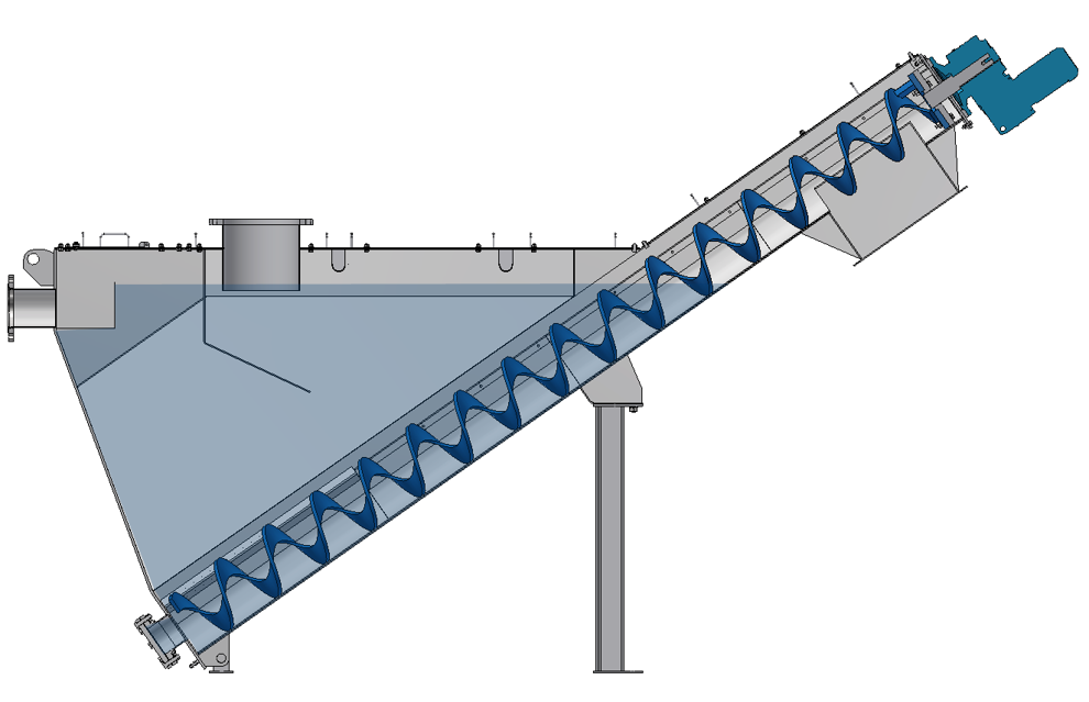 A sediment separator – often also called sand separator – removes sand or other heavy solids from liquids. In a paper mill, those liquids are mainly filtrates from HD cleaners. The principle is quite simple: the feed flow is fed to a sedimentation tank where the heavy particles settle at the bottom; the settled particles are conveyed upwards by an inclined, shaftless screw while being dewatered further; and the dewatered solids drop off at the top of the screw where they are typically collected in a container.