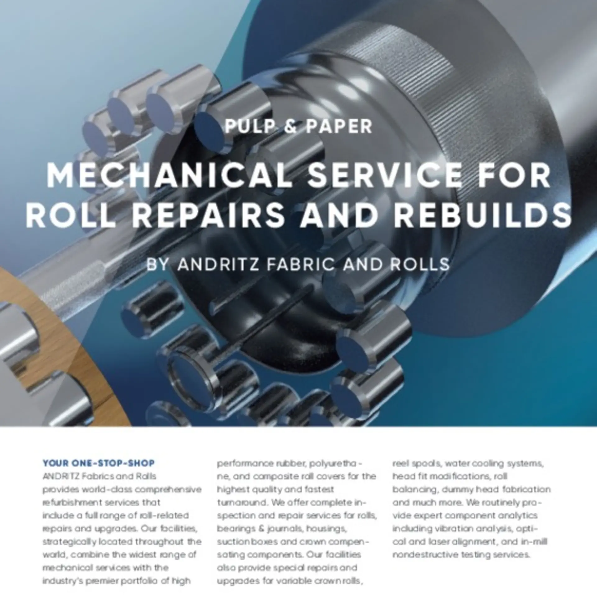 ANDRITZ Fabrics and Rolls provides world-class comprehensive refurbishment services that include a full range of rolls-related repairs and upgrades. Our facilities, strategically located throughout the world, combine the widest range of mechanical services with the industry’s premier portfolio of high performance rubber, polyurethane and composite roll covers for the highest quality and fastest turnaround. We offer complete inspection and repair services for rolls, bearings & journals, housings, suction boxes and crown compensating components. Our facilities also provide special repairs and upgrades for variable crown rolls, reel spools, water cooling systems, head fit modifications, roll balancing, dummy heads fabrication and much more. We routinely provide expert component analytics including vibration analysis, optical and laser alignment, and in-mill nondestructive testing services.