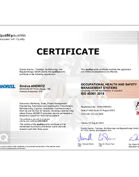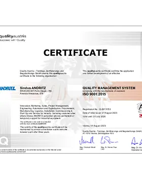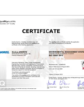 Sindus ANDRITZ is part of the ANDRITZ certification matrix, by Quality Austria cerifier. The objective of this matrix is to seek the standardization of processes and continuous improvement of the legal entities of the ANDRITZ Group. The certifications are ISO 9001:2015 – Quality Management System, ISO 45001:2018 – Occupational Health and Safety Management System and ISO 14001:2015 – Environmental Management System. The integrated management system is implemented at ANDRITZ sites and ensures uniform product standards and worldwide order fulfillment. Accredited certification partners carry out on-site certification audits and confirm the effective and consistent implementation of the the ANDRITZ group standards.