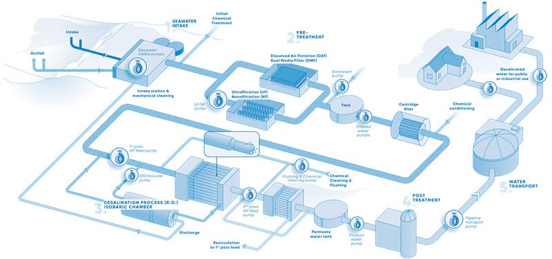 Due to the repeated contact with sea or salt water, the choice of the right material for pumps in desalination plants is crucial. Due to the aggressiveness of the salt water, ANDRITZ pumps are made of a special, resistant material, namely duplex steel. Striking characteristics of duplex steel are their high resistance to surface corrosion, local corrosion and stress corrosion cracking. The structure of this steel is particularly resistant to corrosion fatigue, energy absorption, erosion and abrasion, low thermal expansion and has good weldability. The processing of duplex steel requires extensive practice and know-how. ANDRITZ has long-term experiences in the application of this special material.