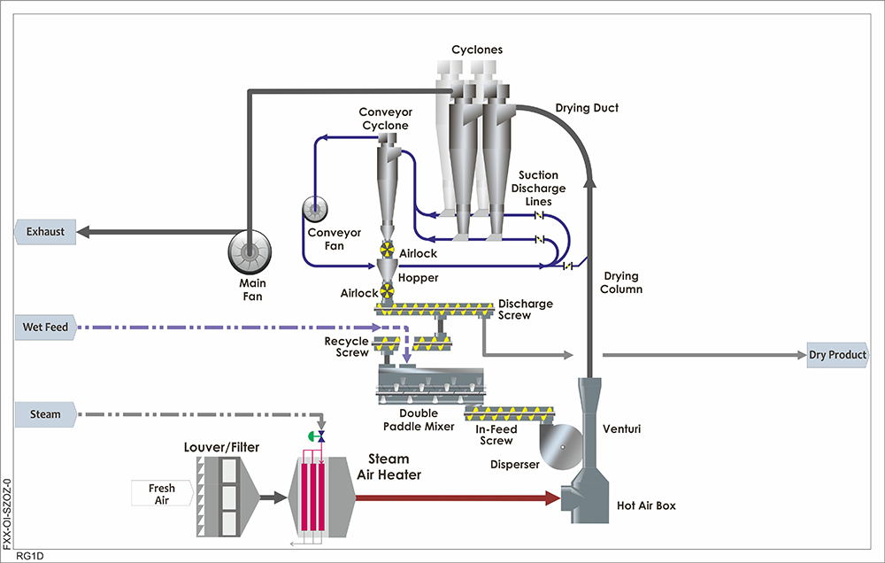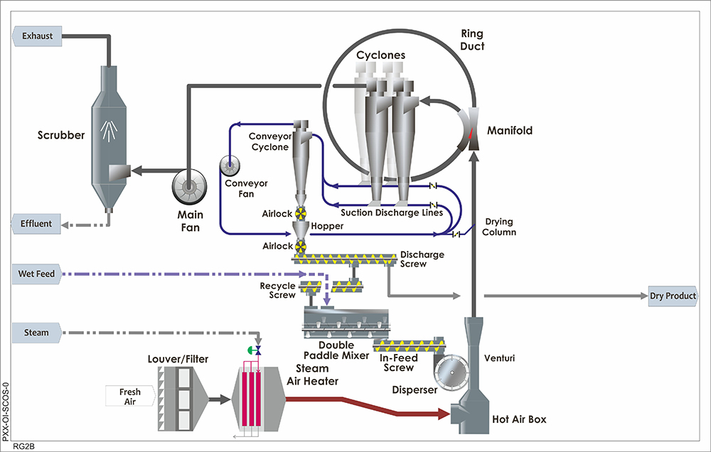 A P-type ring dryer, named after its distinguishable "P" shape, is required for modified corn starch to extend the drying time for the removal of bound or interstitial moisture. Ring drying is an extension to flash drying with the addition of a manifold classifier to allow semi-dry solids to internally circulate until fully dry. The P-type manifold directs the solids recycle back into the lower-temperature exhaust zone for temperature-sensitive corn starch. Nonetheless, residence time remains short, still on the order of a few seconds, so the solids are not exposed to a high-heat environment for a long duration. The ring dryer configuration also enables the dryer to be more energy-efficient relative to a flash dryer designed for the same application.