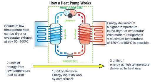 A heat pump system is essentially the opposite of a refrigerator in your home. The system takes energy from a cold source and converts it to a higher temperature using a compressor. There is always one side that is heating up and one side that is cooling down. The lower temperature source is used to evaporate liquid refrigerant in a heat exchanger, transferring heat into it at the lower temperature end of the heat pump. If this were to be a dryer exhaust, it would be in the range of 60oC to 100oC. The now gaseous refrigerant passes through a compressor which increases its temperature and pressure. This high temperature gas then passes into a second heat exchanger where it is condensed at a higher temperature (for modern refrigerants this can be 120oC to 150oC) heating the incoming cold dryer inlet air. The condensing heat exchanger discharges hot liquid refrigerant at high pressure through an expansion valve which reduces the pressure of the liquid, cooling it down so it can pick up heat in the evaporating heat exchanger at the cooler end of the heat pump.