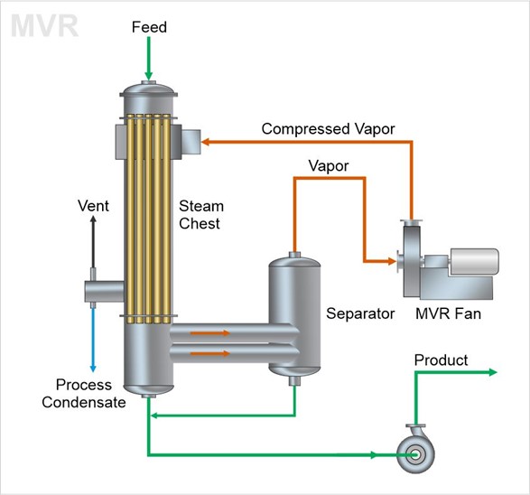 The MVR system is effectively a heat pump which uses an electrically driven fan to raise the temperature of the evaporated steam so it can be reused to heat the evaporator. The electrical power required to drive the fan is about one-third of the energy required to evaporate the water in the system. Dedert is a prime supplier of this state-of-the-art technology.
