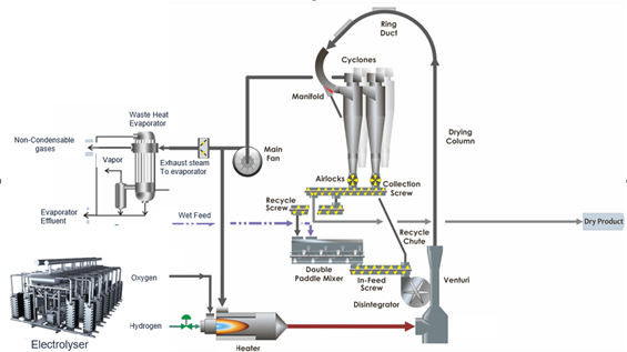 For process gas recycle dryers and superheated steam dryers which can operate with recycled exhaust gas, the use of burners fired by hydrogen and oxygen would offer the opportunity to produce steam in the dryer exhaust and recover the energy by condensing the steam in other processes.