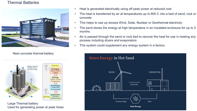 A thermal battery is something that can be heated up to a high temperature and will stay hot for a long period of time. A few different types of thermal batteries are currently being proposed. A Finnish company has created hot batteries made of sand, where the energy will be stored. Essentially, holes are made in the sand and are then filled with tubes. Surplus electrical energy is used to heat up the sand to 600°C by blowing hot air into the tubes. If insulated well enough, this bed of sand can stay heated for months. Recovery of the heat is achieved by drawing air through the tubes to heat whatever system is desired.