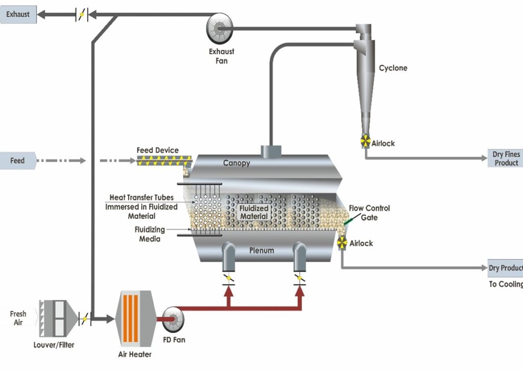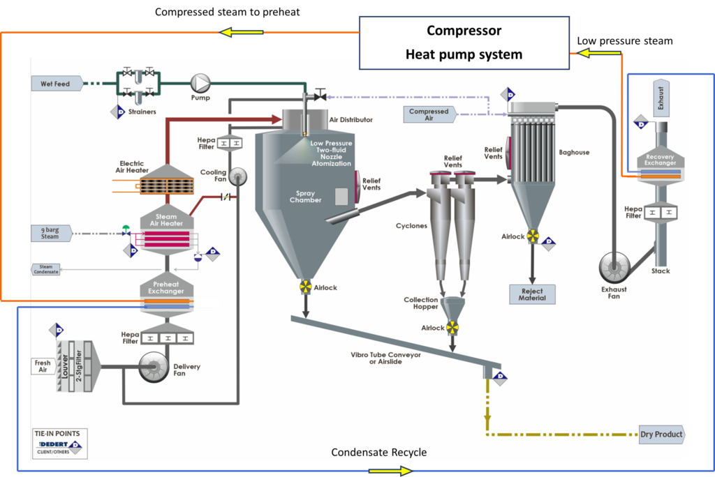 Some of Dedert’s fluidized bed dryer systems already have heat exchangers inside the bed instead of using an air heater on the outside. Most of the heat is provided by heating tubes immersed in the fluidized material with steam. The inlet temperatures are relatively low, ranging from 120°C to 150°C. A heat pump could be used to transfer heat from the dryer exhaust to the tubes using a high temperature refrigerant. Conversely, an MVR (mechanical vapor recompression) system like that used in Dedert’s evaporator systems could be used by compressing the exhaust steam and feeding it back into the heating tubes. This would reduce the energy input by approximately 60%, which would come from electricity.