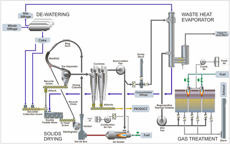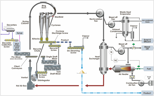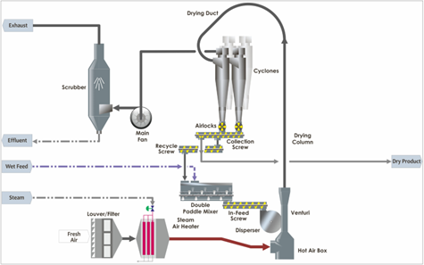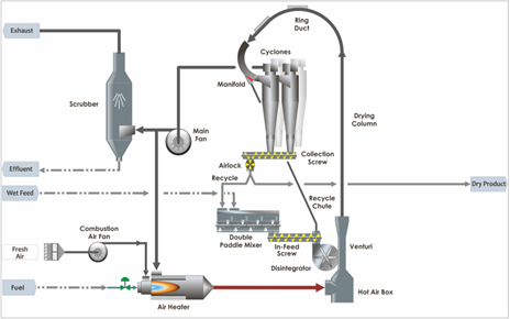 Typically, the recycle stream is about 70% of the dryer exhaust and the remaining 30% which contains the evaporated water and the combustion products from the burner is termed the bleed-off. A specialized type of flash dryer termed a Ring Dryer is most often used for this type of drying system to keep the exhaust temperature as low as possible. The bleed off stream has high humidity, so a waste heat evaporator (WHE) or a condensing scrubber may be incorporated to recover energy for the concentration of a different stream or to heat other streams in the plant's operations.