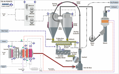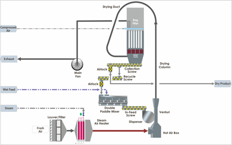 This means that all air is purged from the dryer during start up and it runs with superheated water vapour circulating inside the dryer. With this type of dryer all the bleed off can be condensed so that much of the energy can be reused for other processes in the plant.