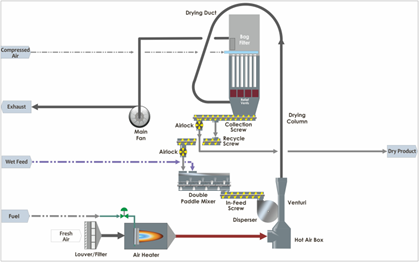 Flash drying is a continuous process that can be heated either directly or indirectly. The moist material is fed into the dryer and exposed to hot air at high velocity. This hot air quickly removes the moisture from the material, producing a dry output that can be easily transported and stored.