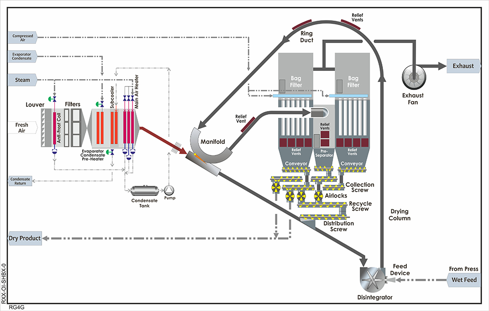 A safe minimum humidity is maintained in the dryer preventing an overly dry environment from developing in the bag filter. During normal operation, water evaporation from the wet gluten is enough to maintain safe humidity levels in the dryer, however this is not the case during start-up, shutdown, upset conditions and turn down operation during which times the addition of steam is required. To minimize steam consumption and save on utility costs, humid dryer exhaust air is recirculated back to the inlet of the dryer, which is a fully automatic function constantly monitored and adjusted by our well defined control system.