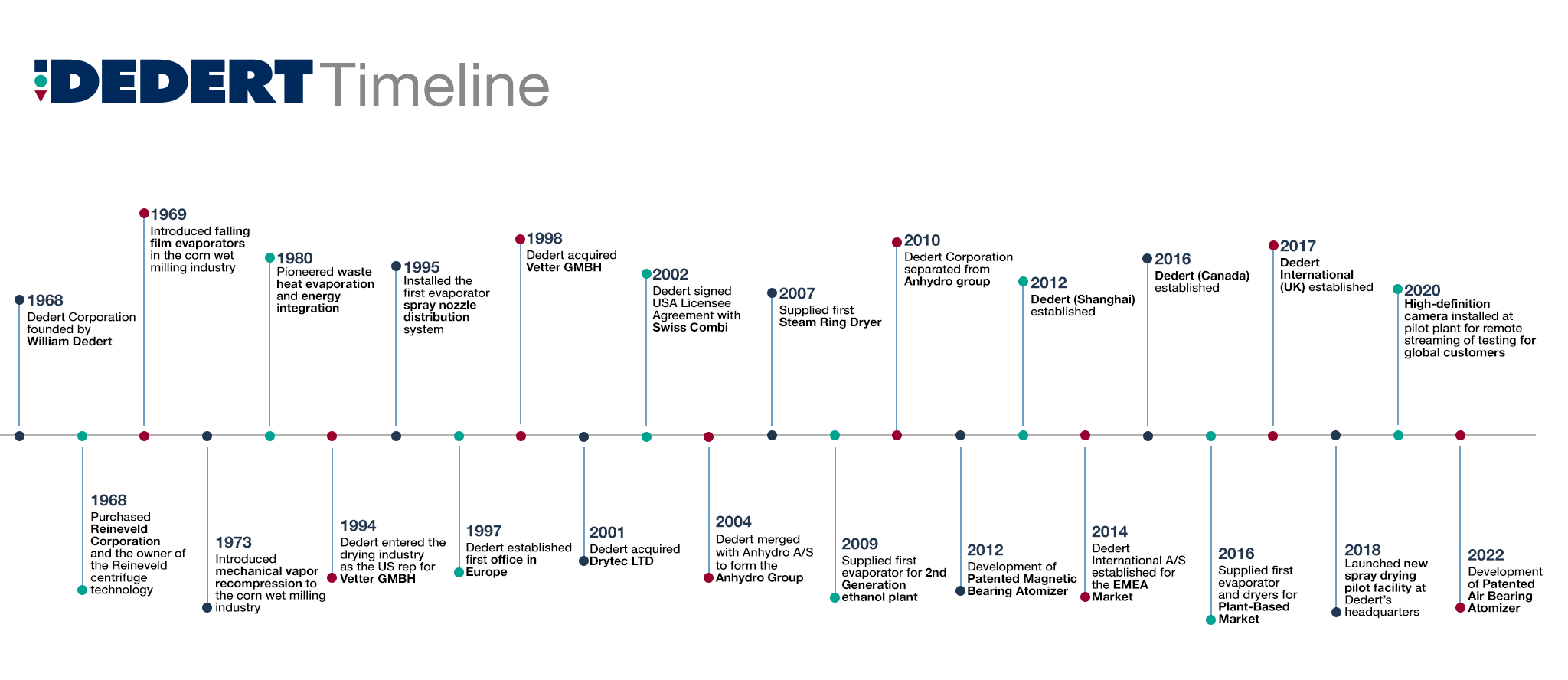 Dedert offers a complete range of advanced liquid and powder processing solutions on an international scale. We have over 50 years of outstanding customer service and innovation in process engineering. Dedert continues to push for new boundaries allowing us to enter new markets to better support for our customers while maintaining timely delivery of the most reliable and efficient systems throughout the world.