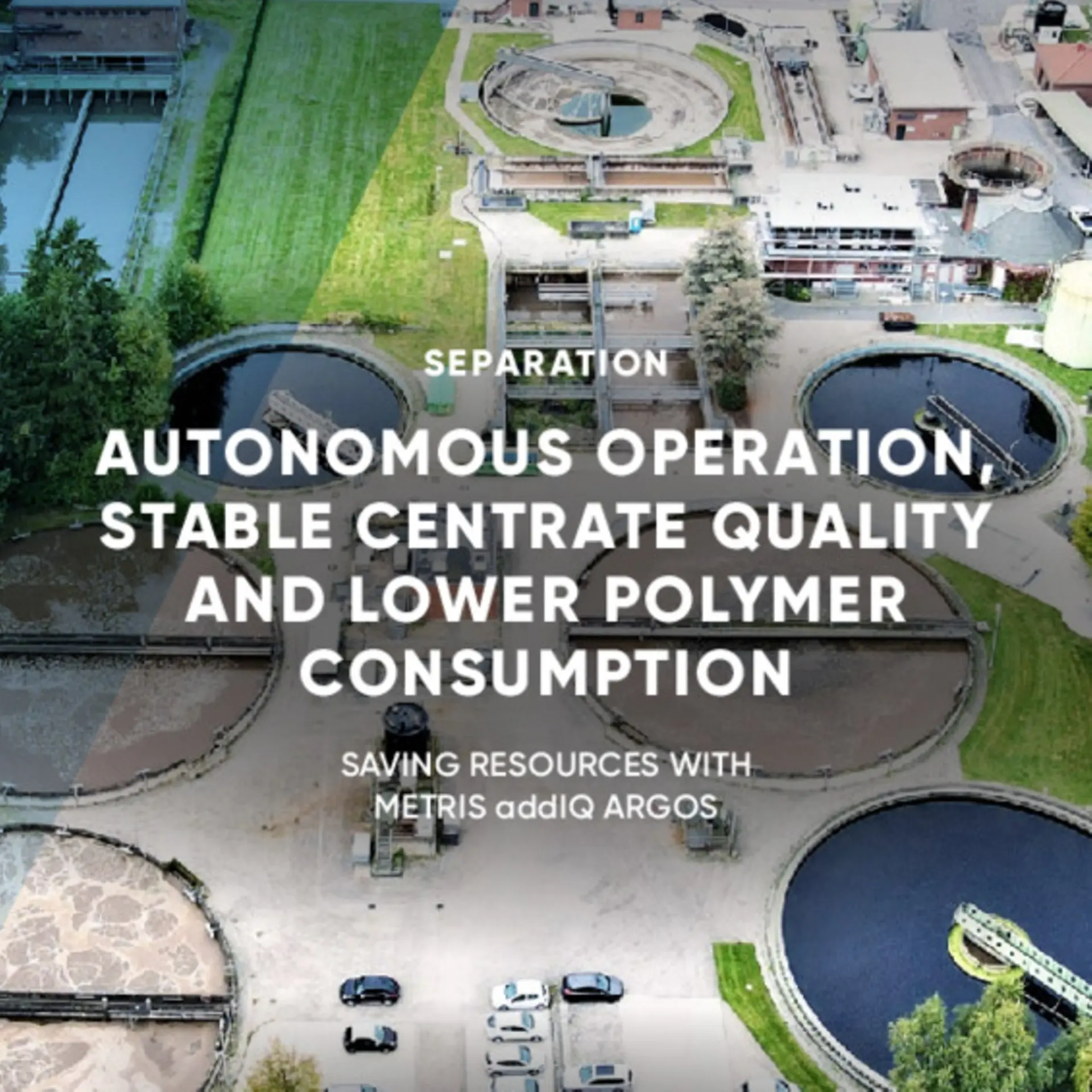 Metris addIQ ARGOS was the obvious solution – an optical measurement system that detects the actual centrate condition throughout the dewatering process. ARGOS adjusts the optimum polymer dose and/or machine setpoint to match changing conditions in the process, even with a foam layer on the centrate. This means autonomous production, which saves time and relieves operators for other important duties, while simultaneously improving performance and delivering process stability and reliability.