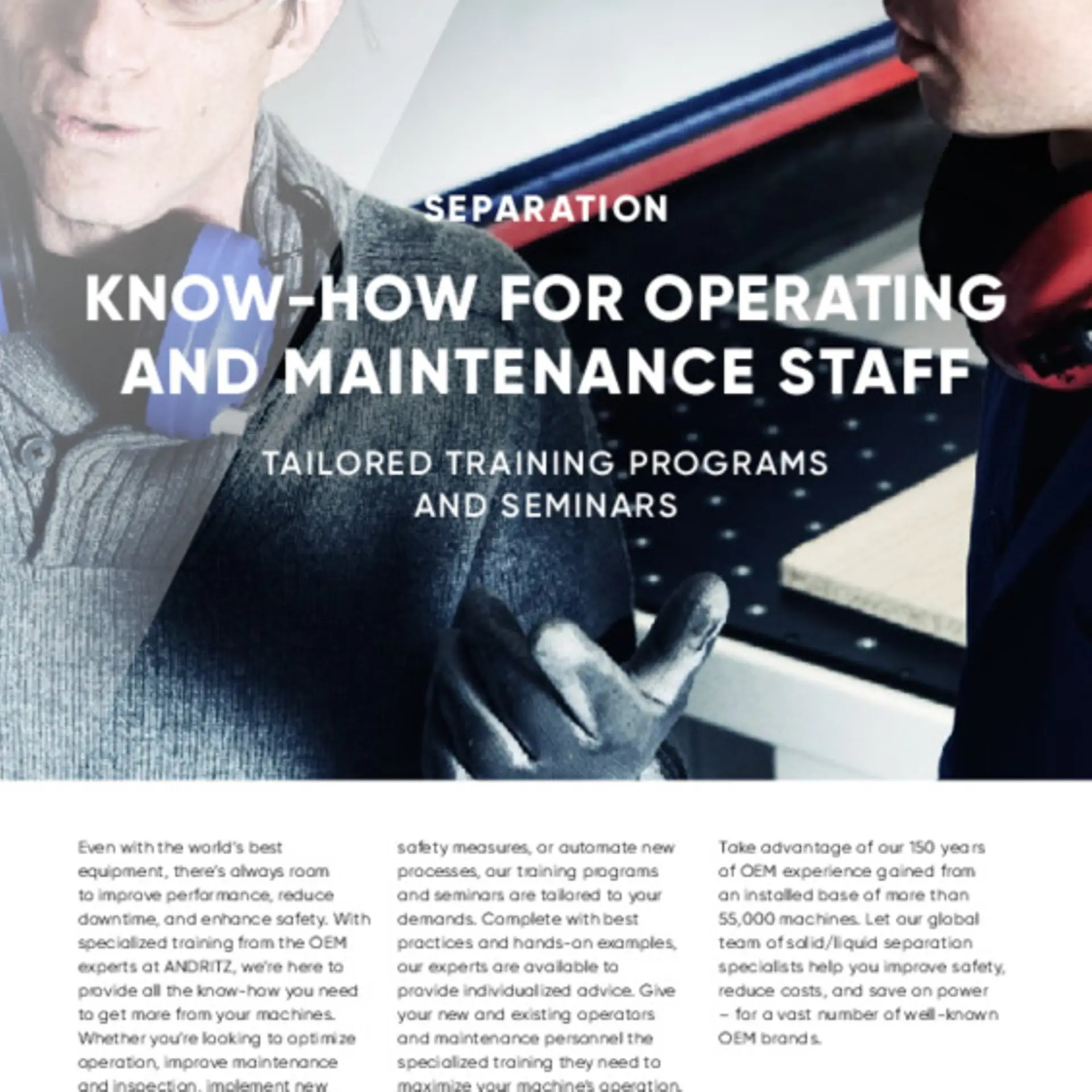 Even with the world’s best equipment, there’s always room to improve performance, reduce downtime, and enhance safety. With specialized training from the OEM experts at ANDRITZ SEPARATION, we’re here to provide all the know-how you need to get more from your machines.