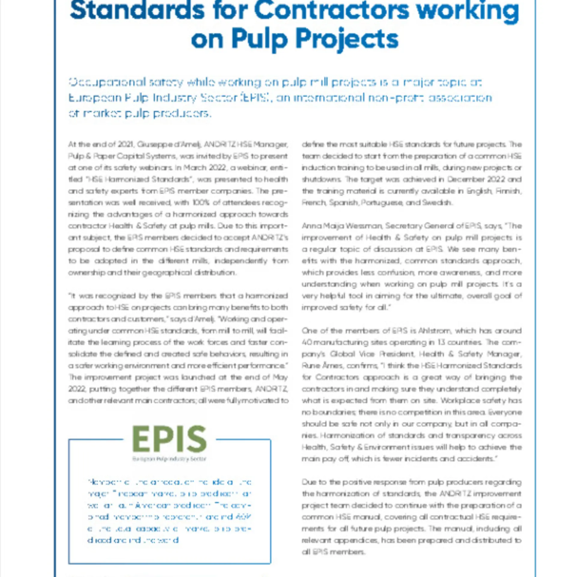 Due to the positive response from pulp producers regarding the harmonization of standards, the ANDRITZ improvement project team decided to continue with the preparation of a common HSE manual, covering all contractual HSE requirements for all future pulp projects. The manual, including all relevant appendices, has been prepared and distributed to all EPIS members.