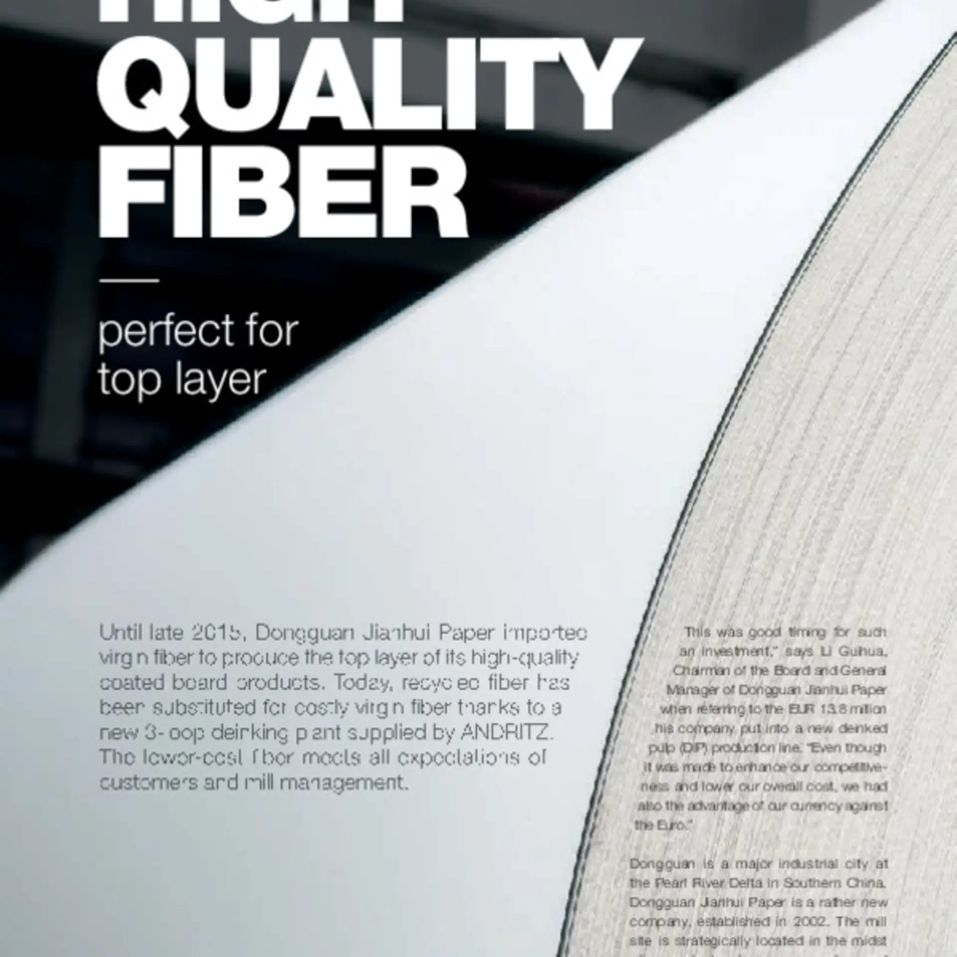 This was good timing for such an investment,” says Li Guihua, Chairman of the Board and General Manager of Dongguan Jianhui Paper, when referring to the new deinked pulp (DIP) production line. Dongguan Jianhui Paper is a rather new company. First production of coated board began in 2004. A second machine followed in 2005. The installation of a third 600,000 t/a line boosted total capacity to 1.4 million t/a.