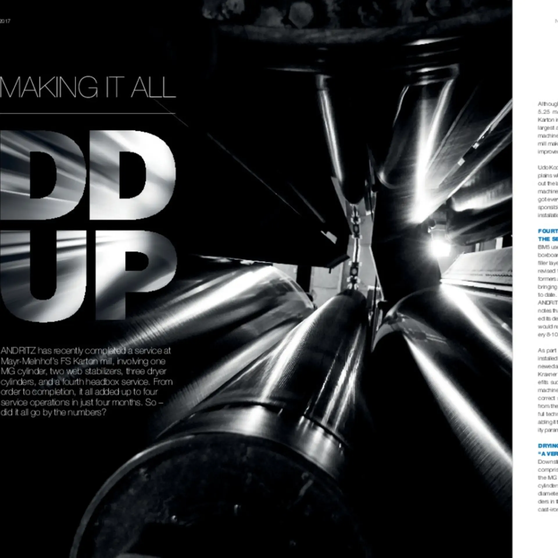 In January 2017, ANDRITZ carried out a suite of service upgrades on the 350,000-tonne BM5 at Mayr-Melnhof’s FS Karton mill in Neuss, Germany, the largest recycled boxboard machine in Europe.