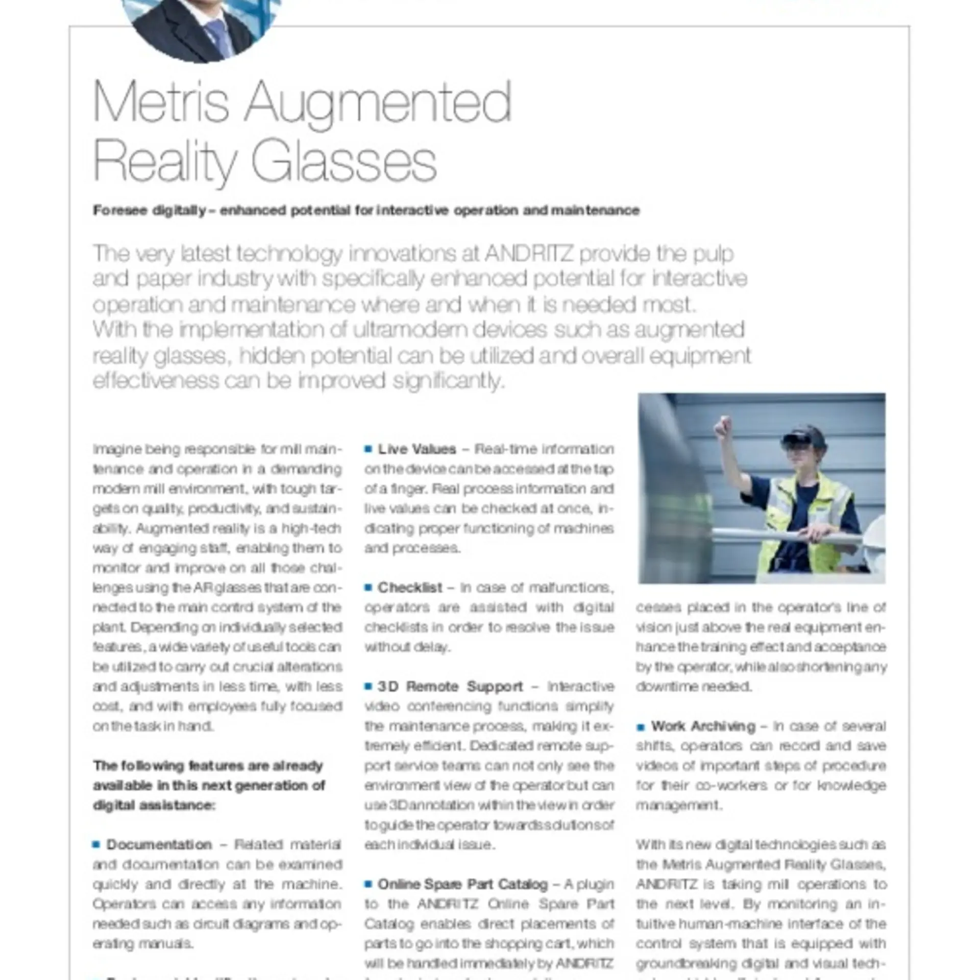 With its new digital technologies such as the Metris Augmented Reality Glasses, ANDRITZ is taking mill operations to the next level. By monitoring an intuitive human-machine interface of the control system that is equipped with groundbreaking digital and visual technology, highly efficient workflows make the future calculable and enable proactive action through the analysis of data. Benefits such as optimized performance and cost-efficiency are achieved with ultramodern digital IIoT solutions.