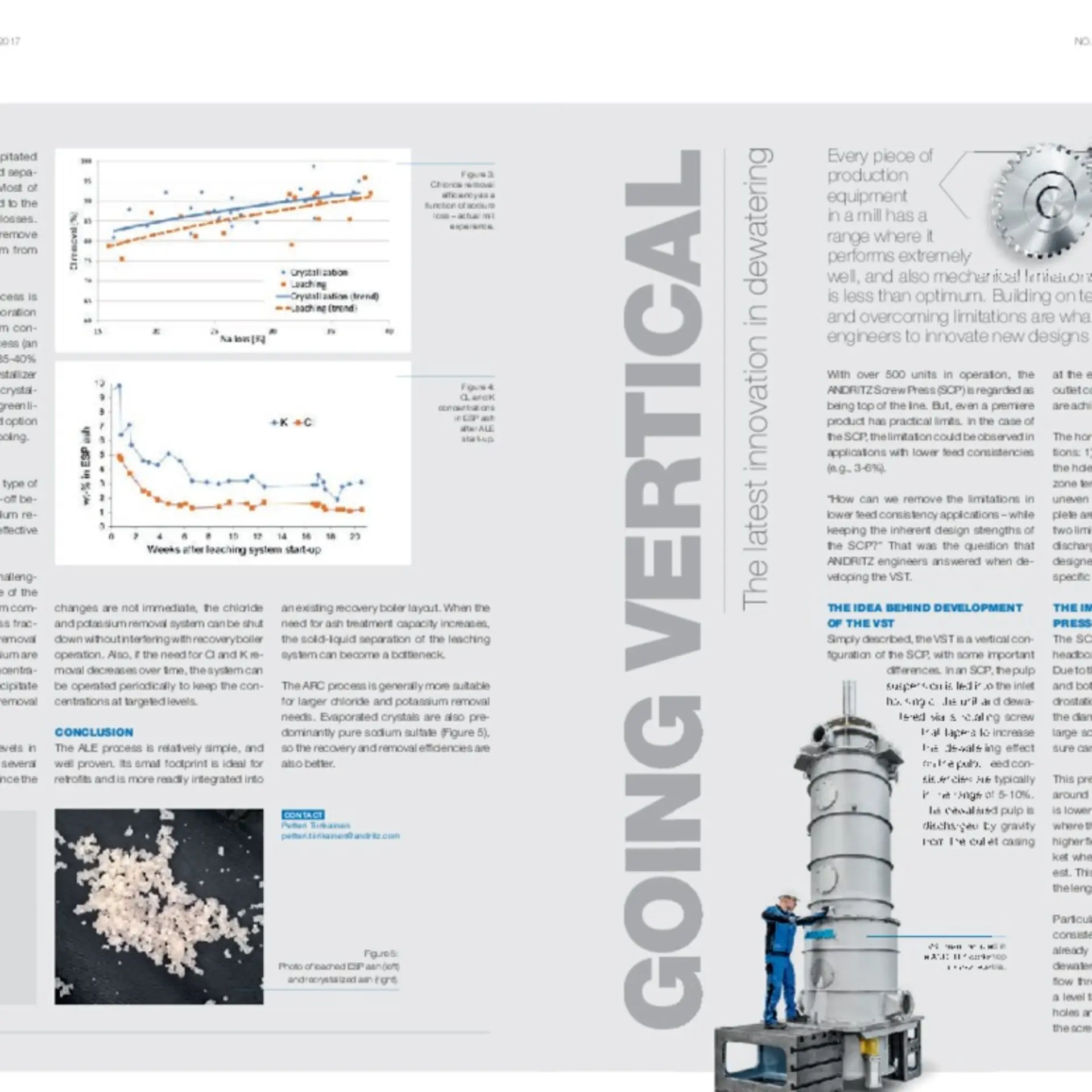 In a VST, the pulp suspension is fed into the top of the machine and gravity transports the pulp downwards. The risk of plugging the inlet screen at low feed consistency applications is almost eliminated. Similar to the SCP, the VST has a conical shaft and decreasing pitch so the pulp is compressed and dewatered as it moves downward. The pulp suspension is automatically and consistently refilled into the area between screw flights. The rotating shaft moves the pressed cake downwards to the outlet casing.