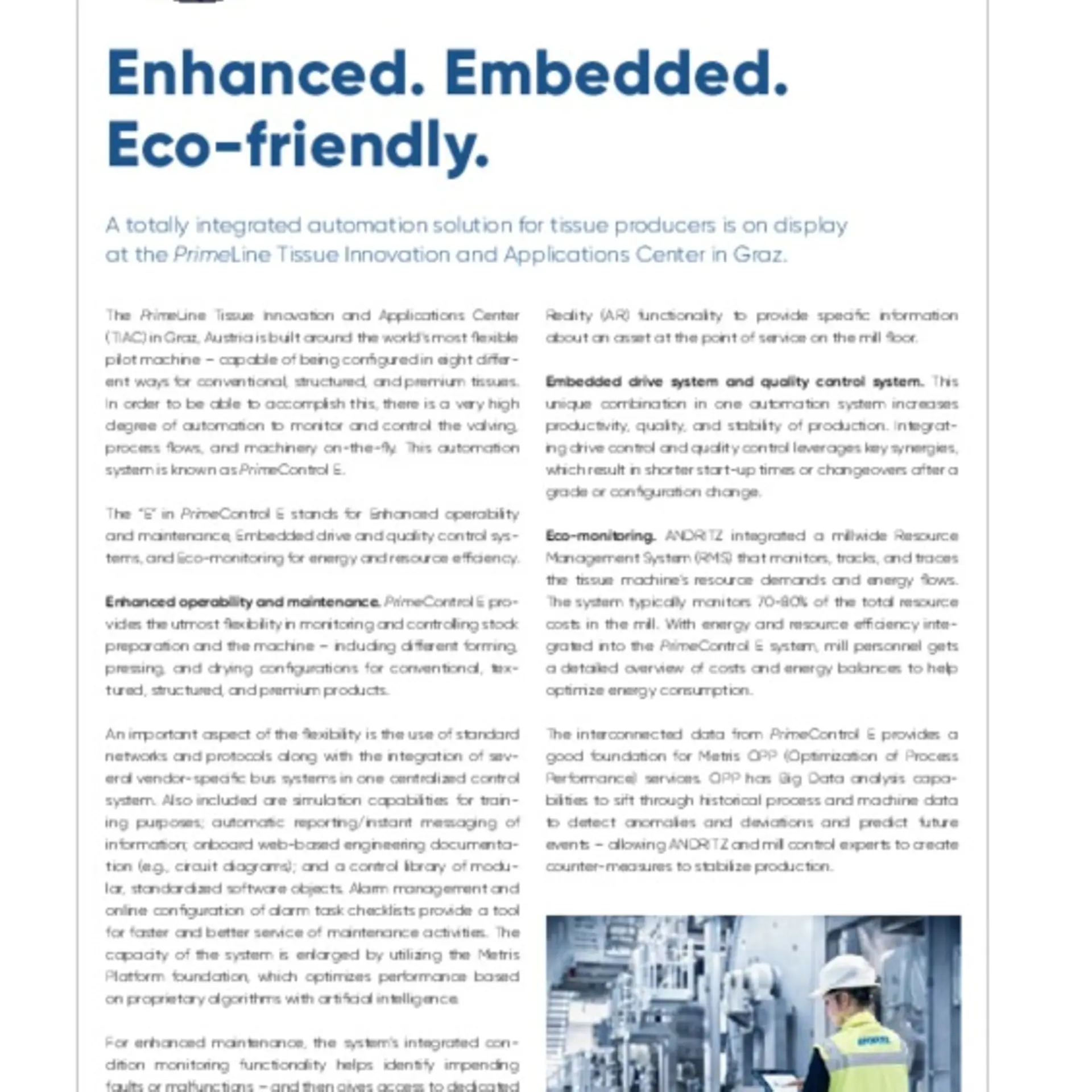 The PrimeLine Tissue Innovation and Applications Center (TIAC) in Graz, Austria is built around the world’s most flexible pilot machine – capable of being configured in eight different ways for conventional, structured, and premium tissues. In order to be able to accomplish this, there is a very high degree of automation to monitor and control the valving, process flows, and machinery on-the-fly. This automation system is known as PrimeControl E.