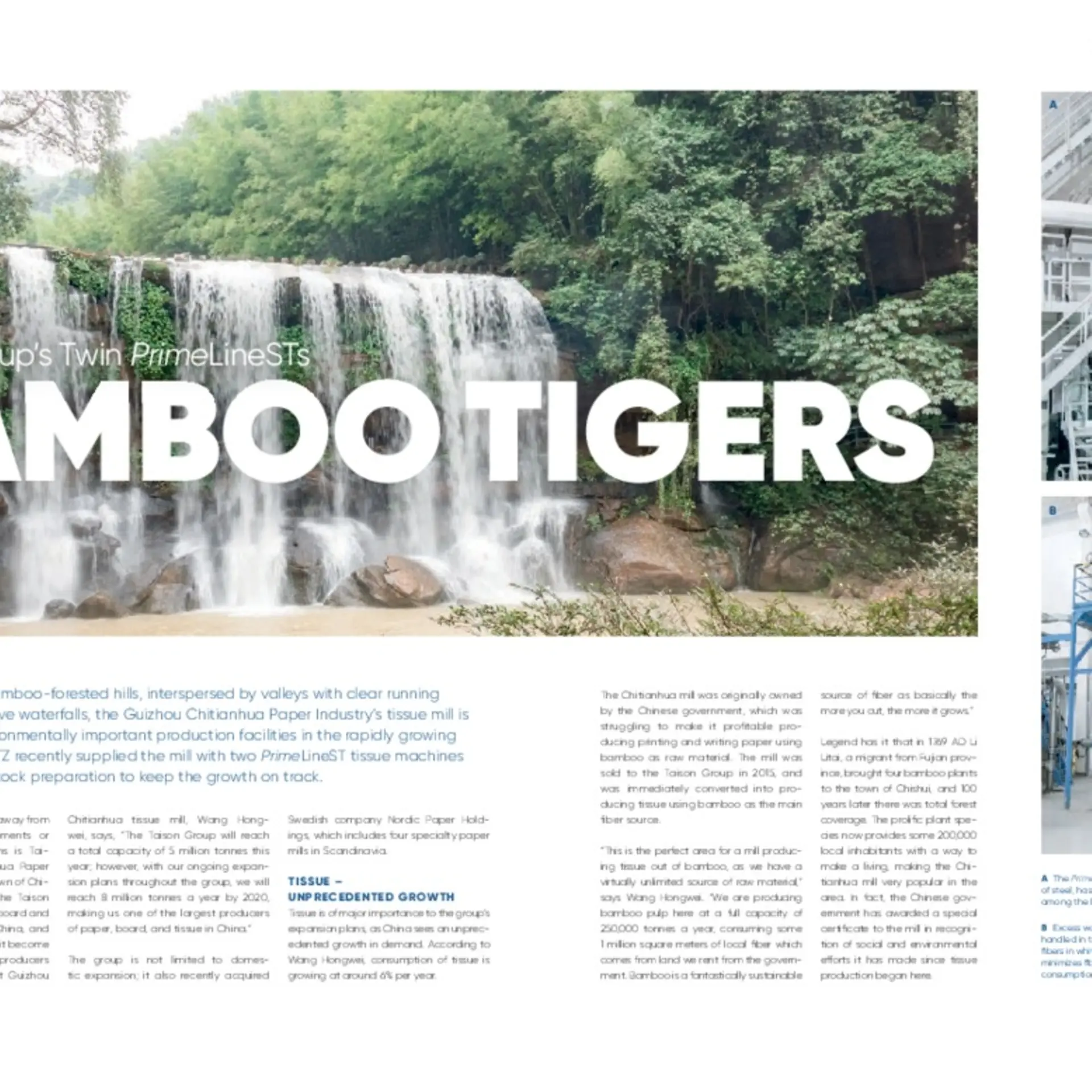 Set among thickly bamboo-forested hills, interspersed by valleys with clear running streams and impressive waterfalls, the Guizhou Chitianhua Paper Industry’s tissue mill is one of the most environmentally important production facilities in the rapidly growing Taison Group. ANDRITZ recently supplied the mill with two PrimeLineST tissue machines including complete stock preparation to keep the growth on track.