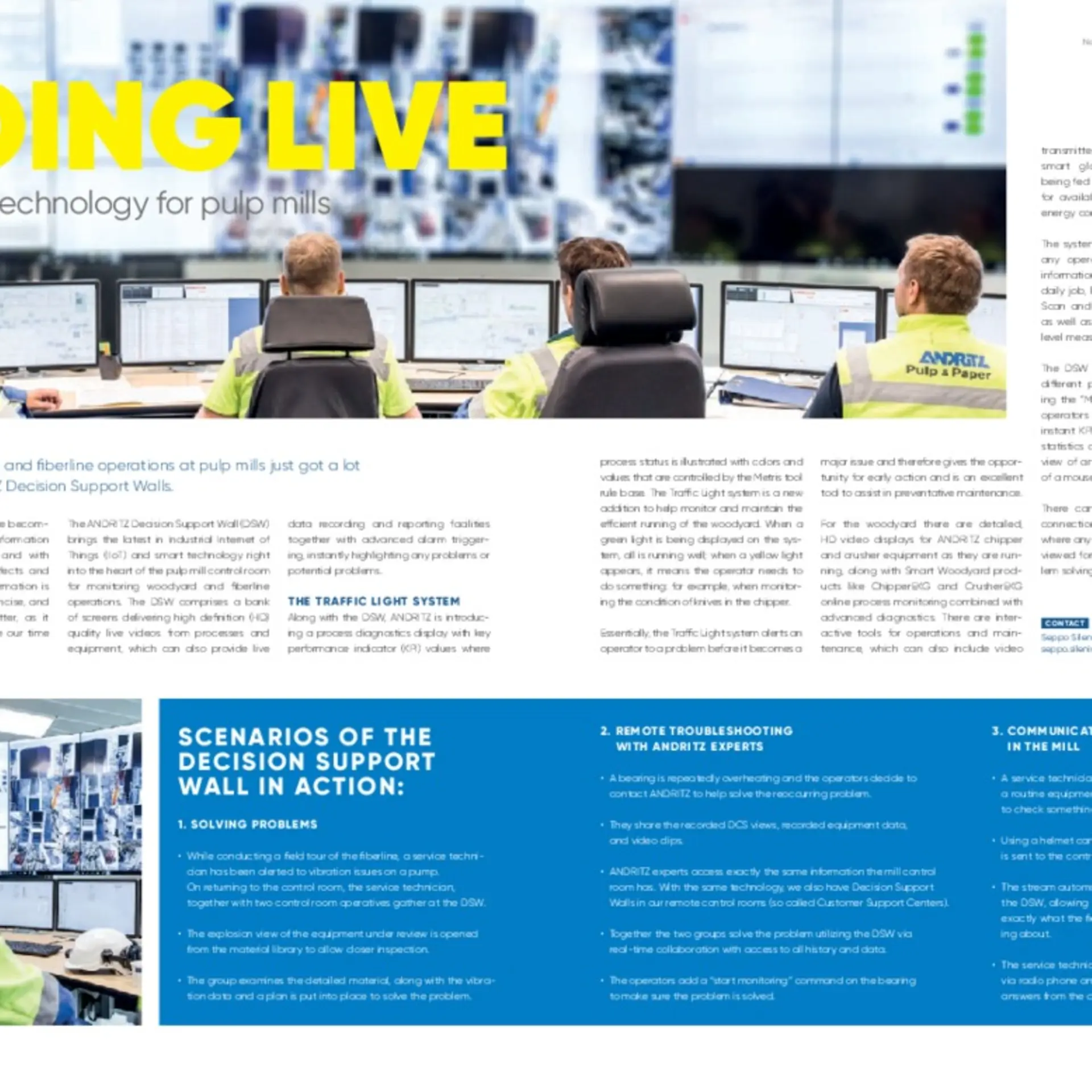 The ANDRITZ Decision Support Wall (DSW) brings the latest in Industrial Internet of Things (IIoT) and smart technology right into the heart of the pulp mill control room for monitoring woodyard and fiberline operations. The DSW comprises a bank of screens delivering high definition (HD) quality live videos from processes and equipment, which can also provide live data recording and reporting facilities together with advanced alarm triggering, instantly highlighting any problems or potential problems.