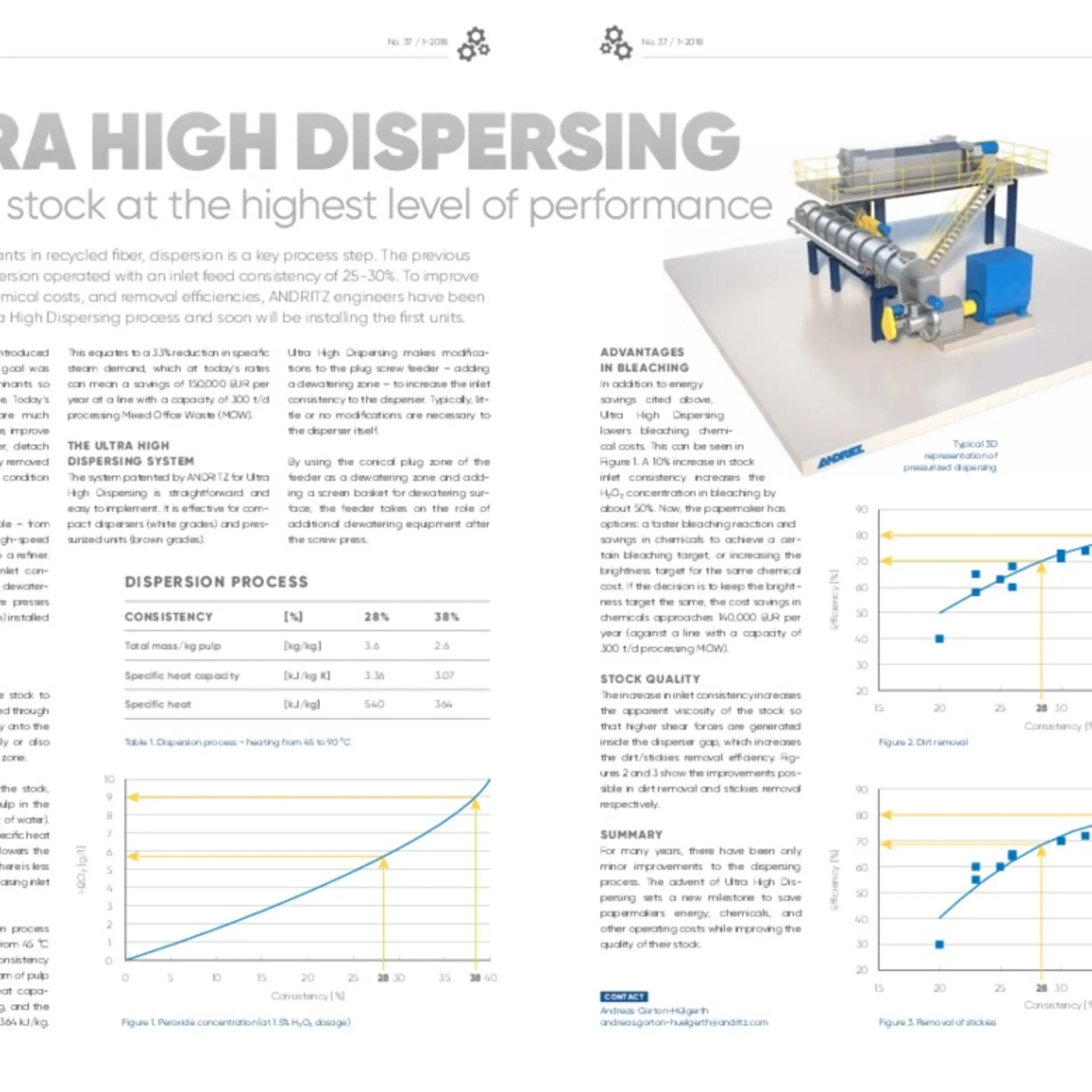 Due to the contaminants in recycled fiber, dispersion is a key process step. The previous state-of-the-art dispersion operated with an inlet feed consistency of 25-30%. To improve energy efficiency, chemical costs, and removal efficiencies, ANDRITZ engineers have been innovating on an Ultra High Dispersing process and soon will be installing the first units.