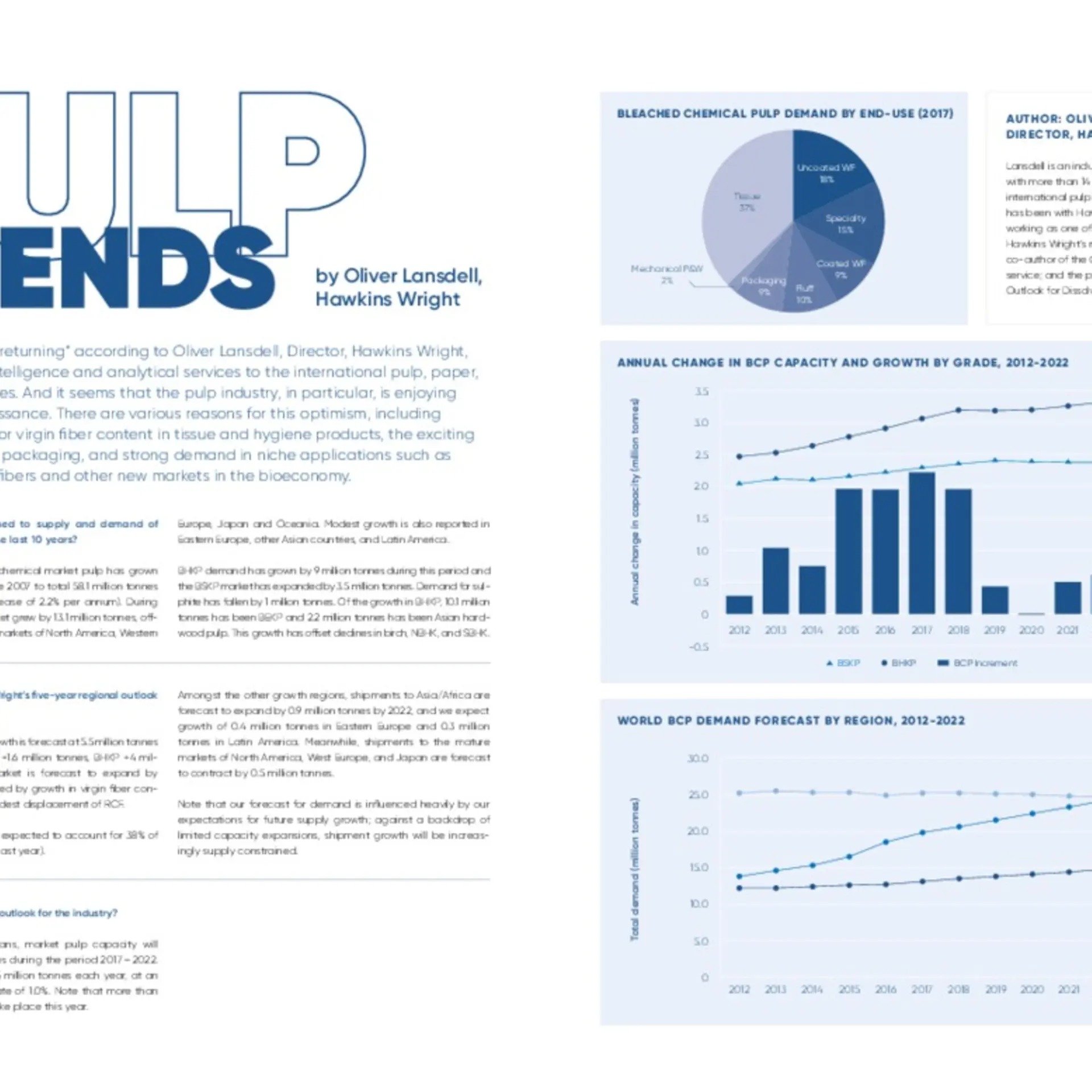 Demand for bleached chemical market pulp has grown by 11.5 million tonnes since 2007 to total 58.1 million tonnes last year (an average increase of 2.2% per annum). During this period, the Chinese market grew by 13.1 million tonnes, offsetting declines in the mature markets of North America, Western Europe, Japan and Oceania. Modest growth is also reported in Eastern Europe, other Asian countries, and Latin America. BHKP demand has grown by 9 million tonnes during this period and the BSKP market has expanded by 3.5 million tonnes. Demand for sulphite has fallen by 1 million tonnes. Of the growth in BHKP, 10.1 million tonnes has been BEKP and 2.2 million tonnes has been Asian hardwood pulp. This growth has offset declines in birch, NBHK, and SBHK.