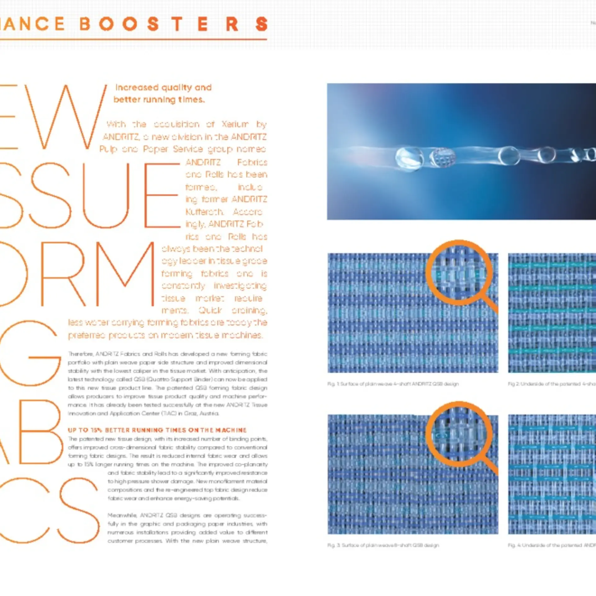 ANDRITZ Fabrics and Rolls tissue product line including the patented QSB technology is available in 2:1 and 3:2 weft ratios for all tissue products and former designs.