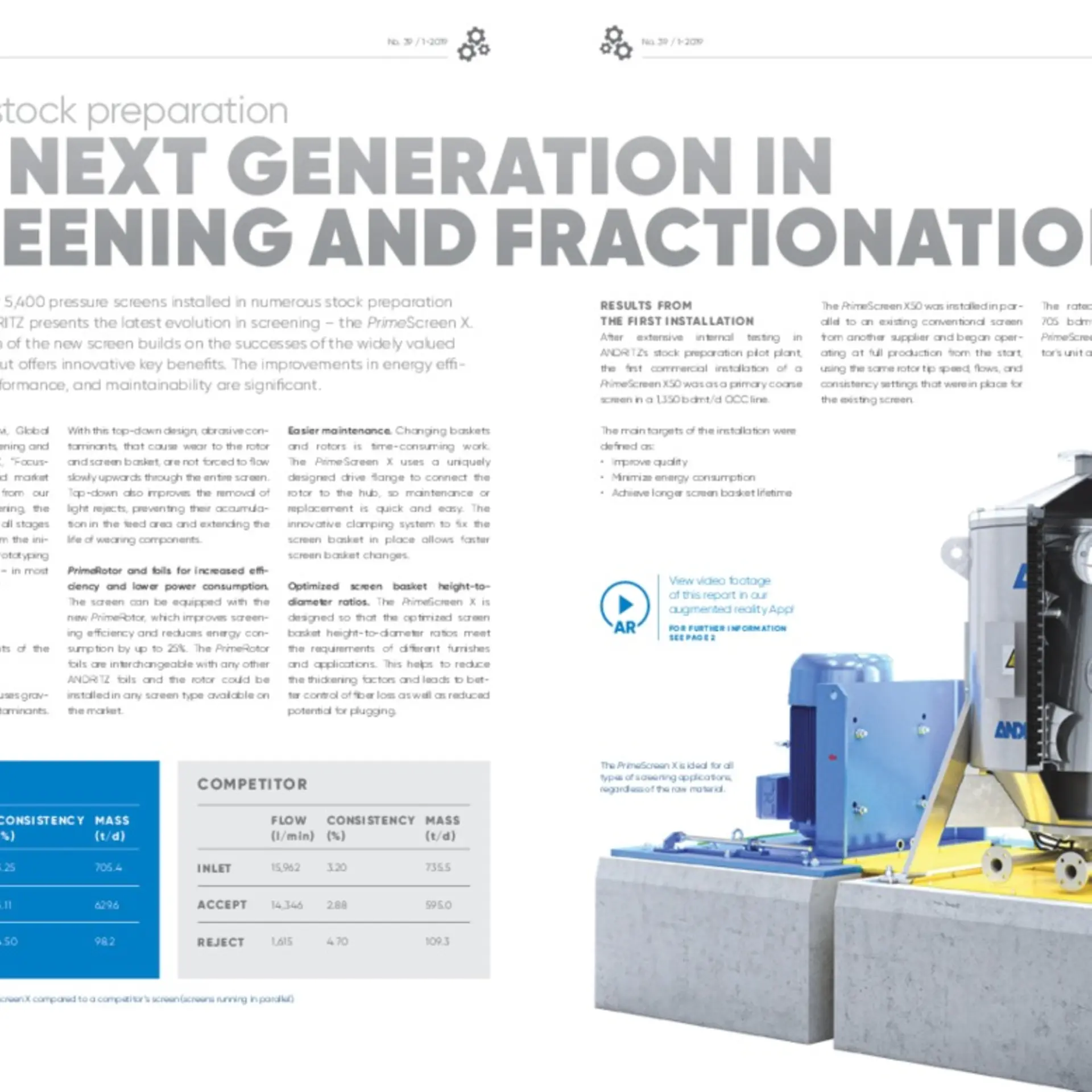 Well-known with over 5,400 pressure screens installed in numerous stock preparation lines worldwide, ANDRITZ presents the latest evolution in screening – the PrimeScreen X. The innovative design of the new screen builds on the successes of the widely valued ModuScreen family, but offers innovative key benefits. The improvements in energy efficiency, screening performance, and maintainability are significant.