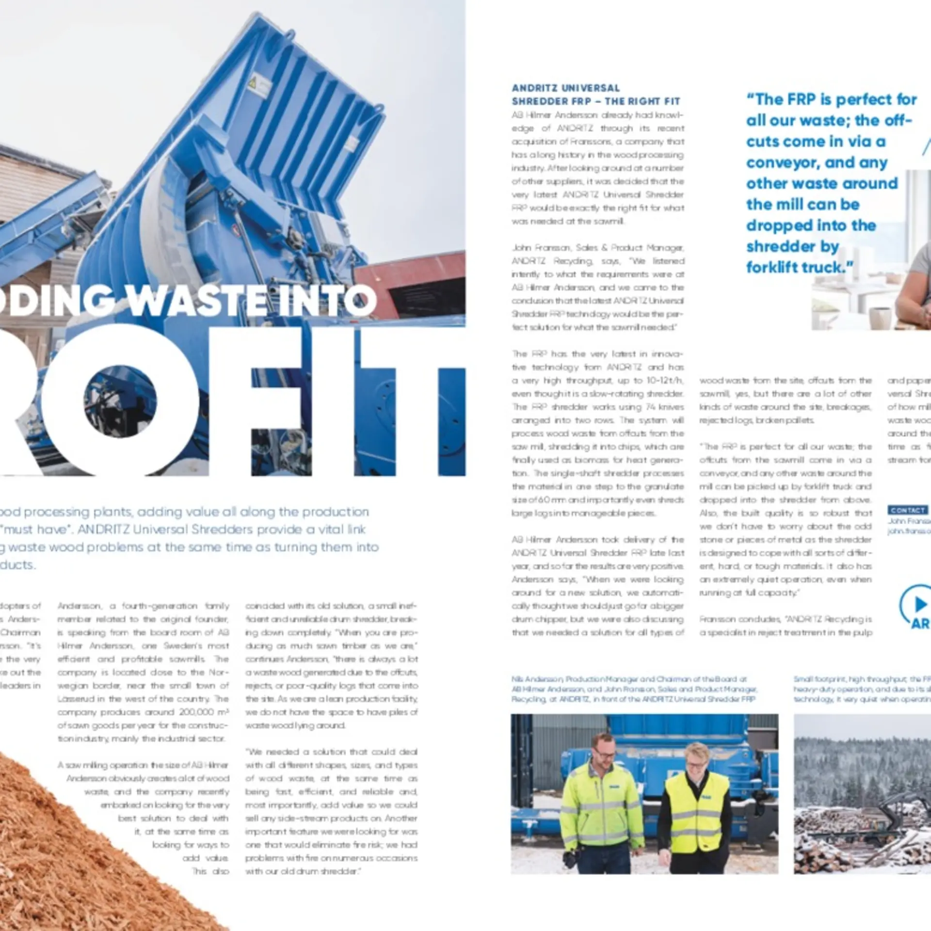 John Fransson, Sales & Product Manager, ANDRITZ Recycling, concludes, “ANDRITZ Recycling is a specialist in reject treatment in the pulp and paper industry, and the ANDRITZ Universal Shredder FRP is a prime example of how mills can deal with the problem of waste wood, bark, or rejected logs from all around the mill or woodyard, at the same time as finding another valuable sidestream from the production process.”